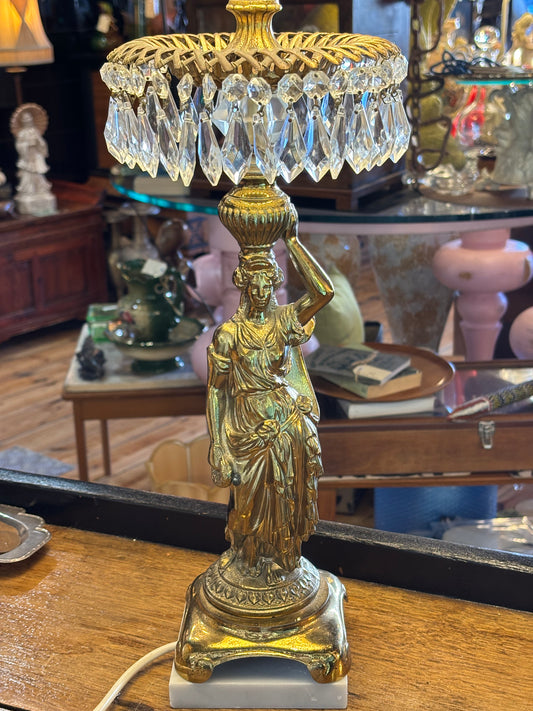 Vintage Gilded Lady Lamp with Crystal Drops & Pleated Shade