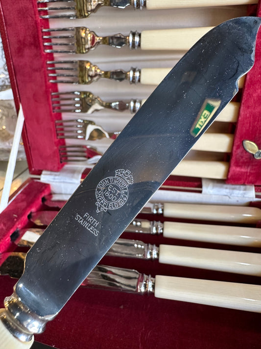 Vintage fish cutlery set (stainless steel) housed in a red-lined presentation box, England Sheffield
