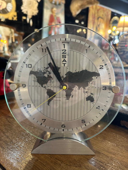 Vintage Silver World Time Desk Clock with Day-Date | Retro Map Dial Travel Decor