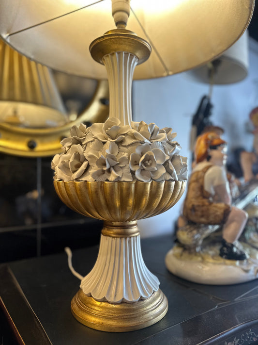 Vintage Italian Capodimonte Style Porcelain Floral Lamp | Hollywood Regency Gold Gilt Table Lamp