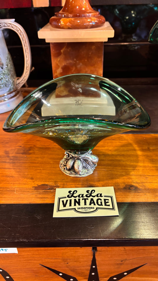 Vintage Italian Green Crystal Pedestal Bowl – Cristalli d’Oggi – Ornate Silver Fruit Base – 23cm