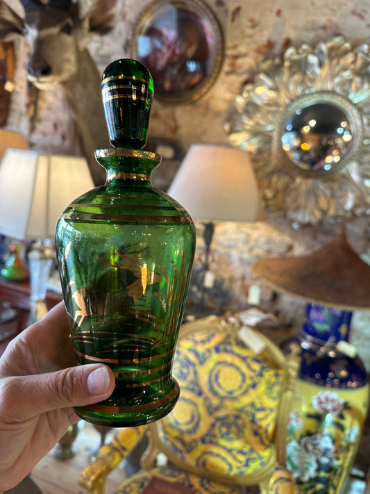 Vintage Green and Gold Bohemian Glass Decanter with Deer Design