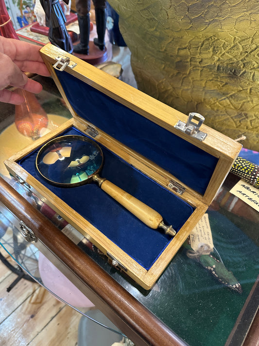 Vintage Hand Held Magnifying Glass in Wooden Box