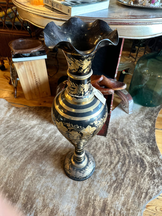 Vintage Black and Brass Base Etched with Flowers and Scalloped Edge