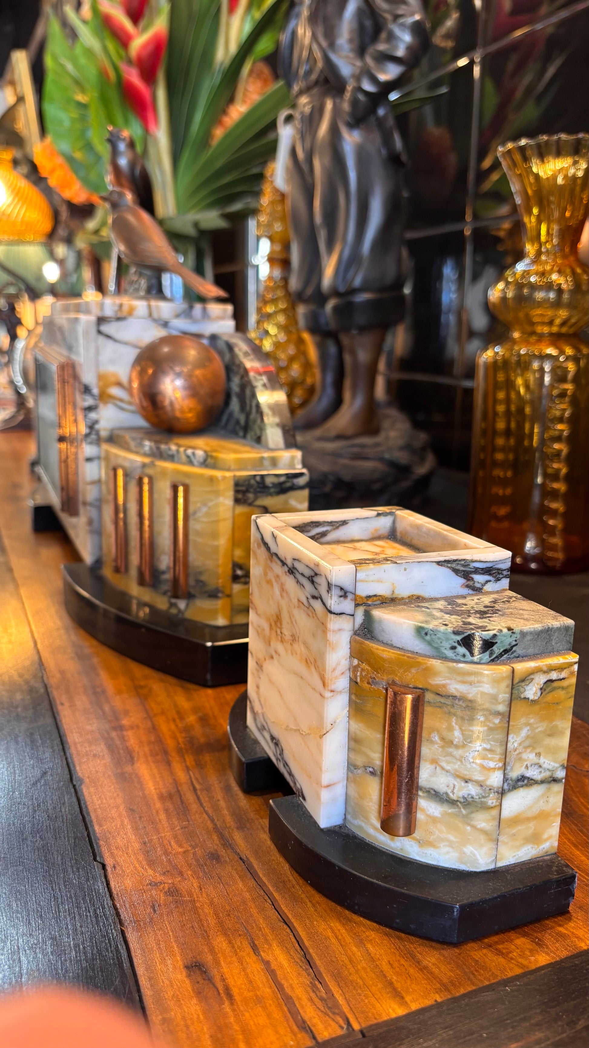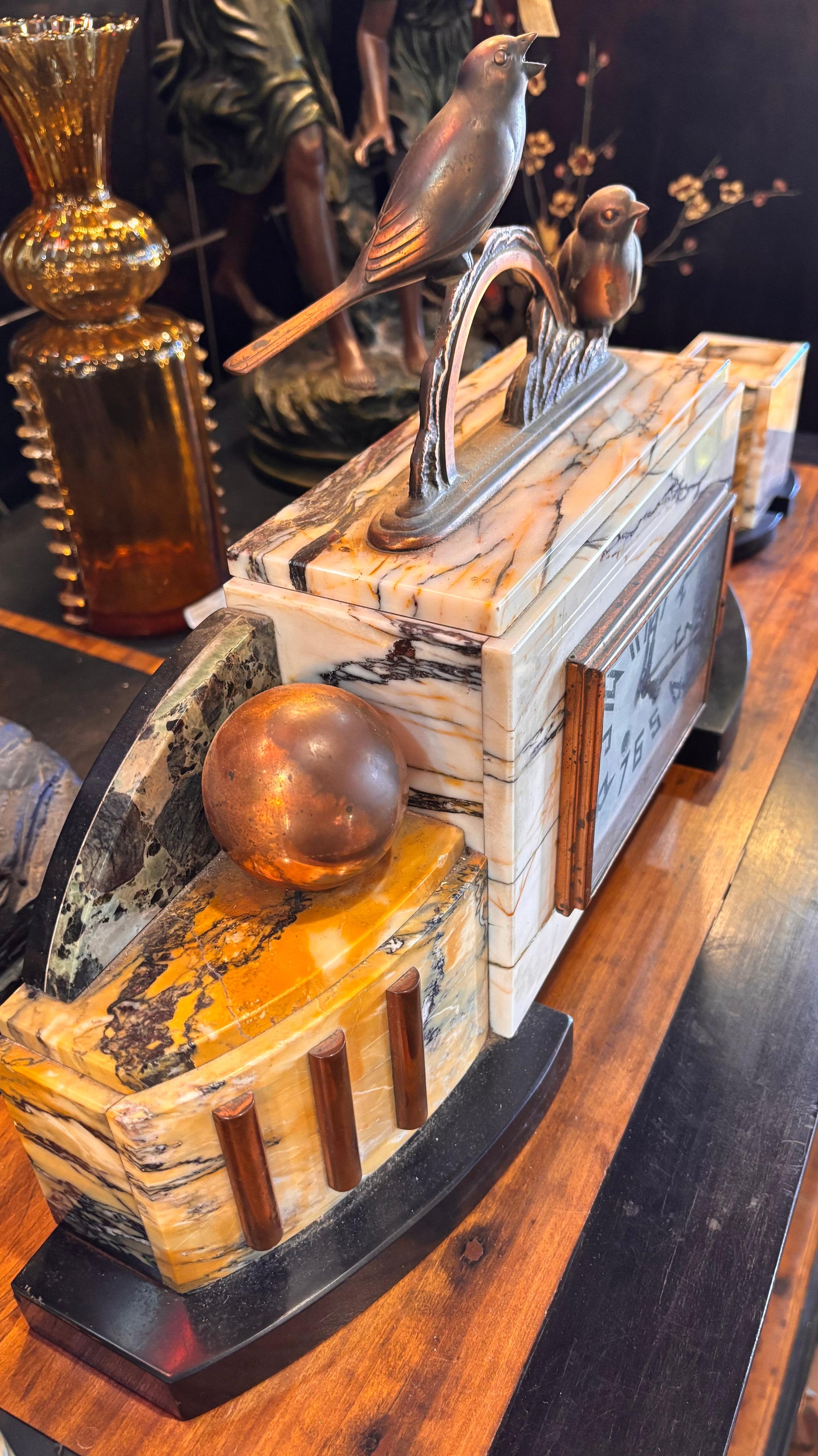 Flanking the clock are two matching garniture pieces and a pair of beautifully sculpted birds (likely made from spelter) with a bronze-look finish, offering both elegance and character. While the clock’s movement remains untested, the set stands as a stunning example of Deco-era craftsmanship and design.