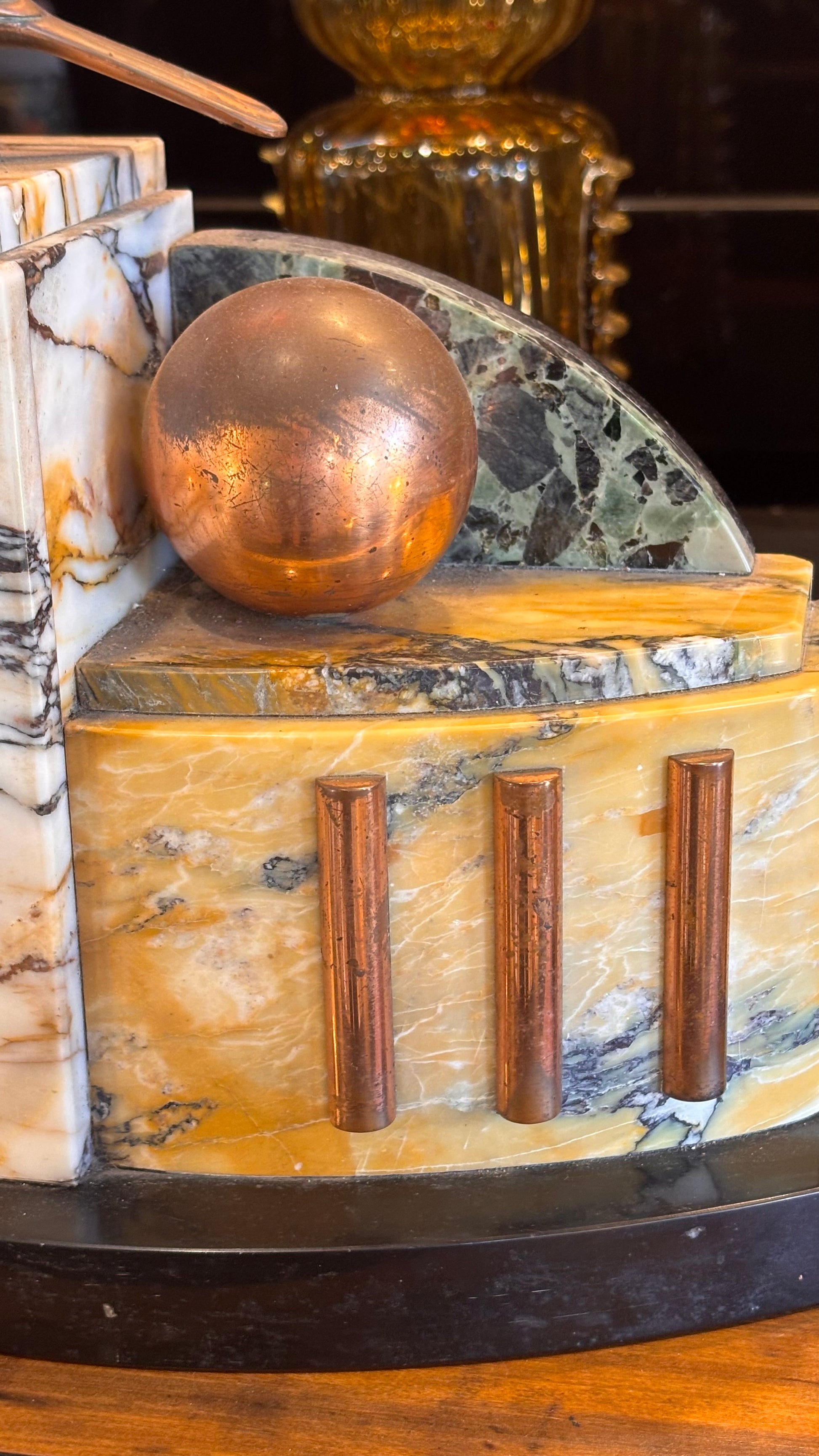 A striking original 1930s French Art Deco clock garniture set, featuring geometric symmetry, rich natural materials, and a pair of poised bird sculptures. The body is crafted from a blend of white-veined marble, warm Sienna marble, and green stone accents, framed by copper or brass detailing. At the center, the clock sits behind its original glass cover, with the original winding key still included.