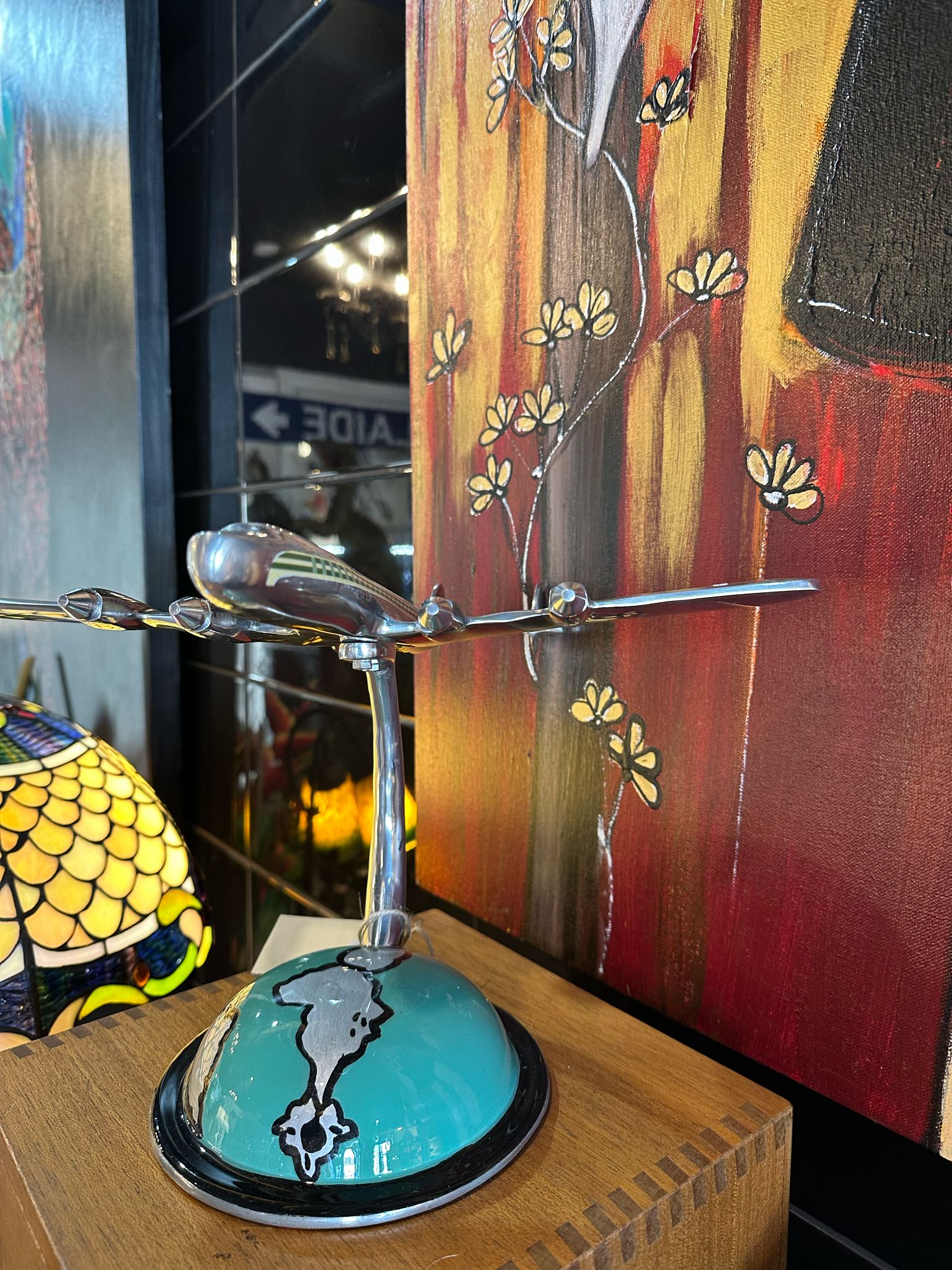 This art deco style aeroplane on a desk stand combines elegance and worldly charm. The perfect addition to any home or office it is beautifully mounted on a world base.