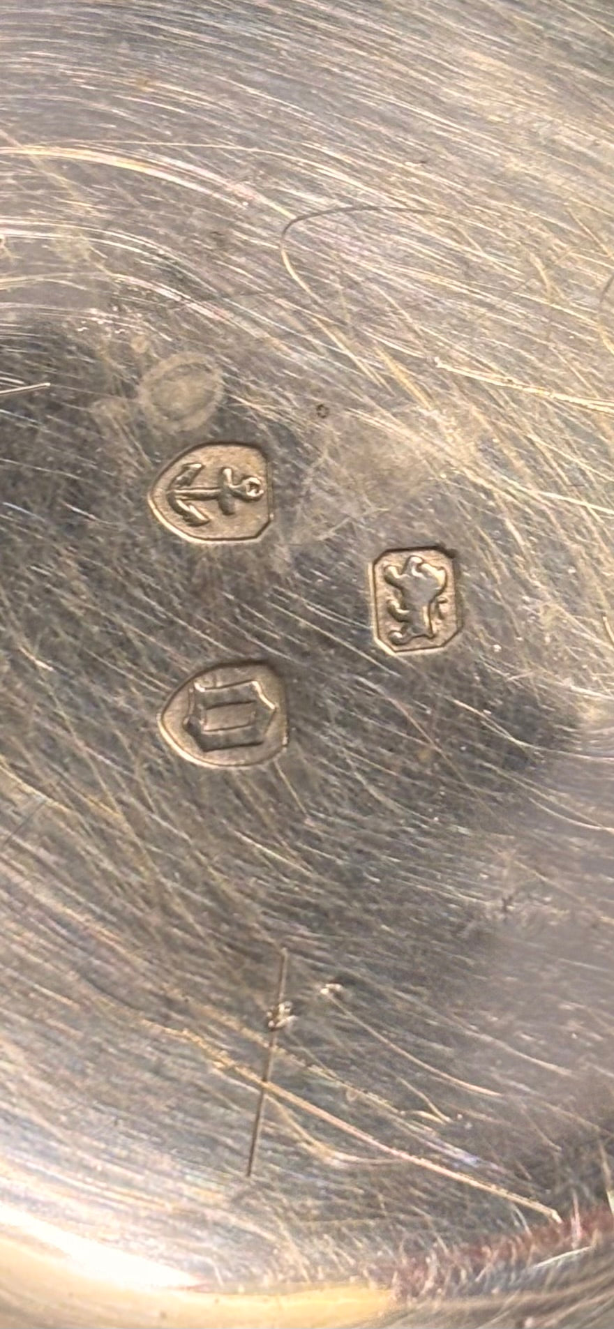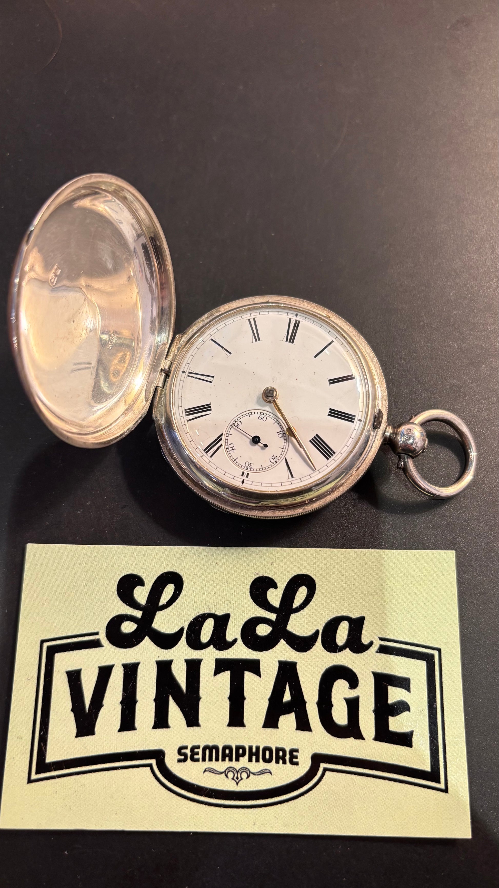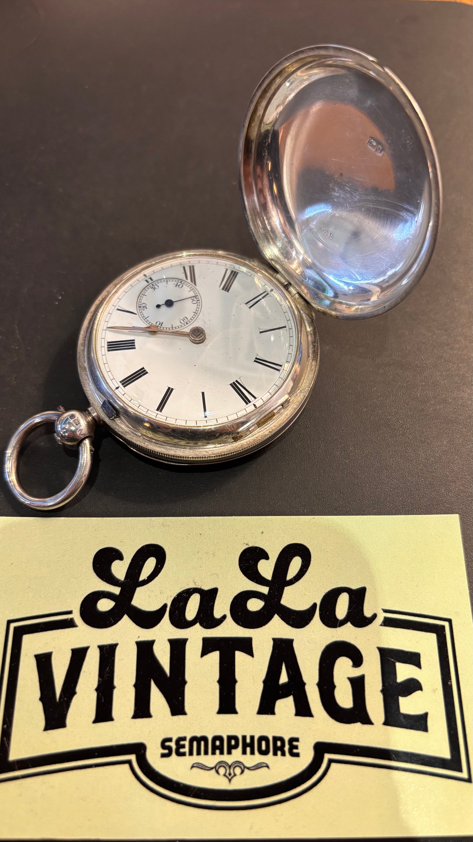 The watch features an elegant full hunter case with engine-turned detailing and a cartouche, Roman numeral enamel dial, and subsidiary seconds dial. The hallmarks confirm solid sterling silver and authenticity throughout.