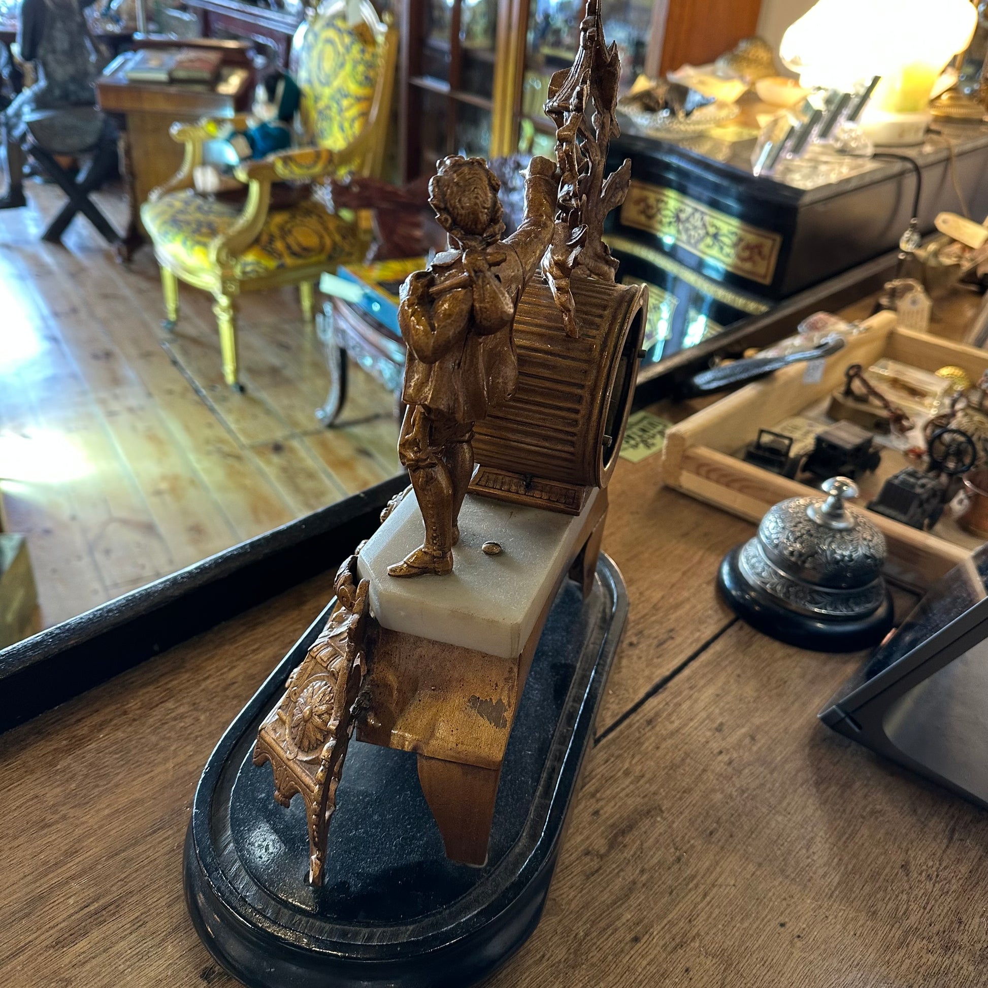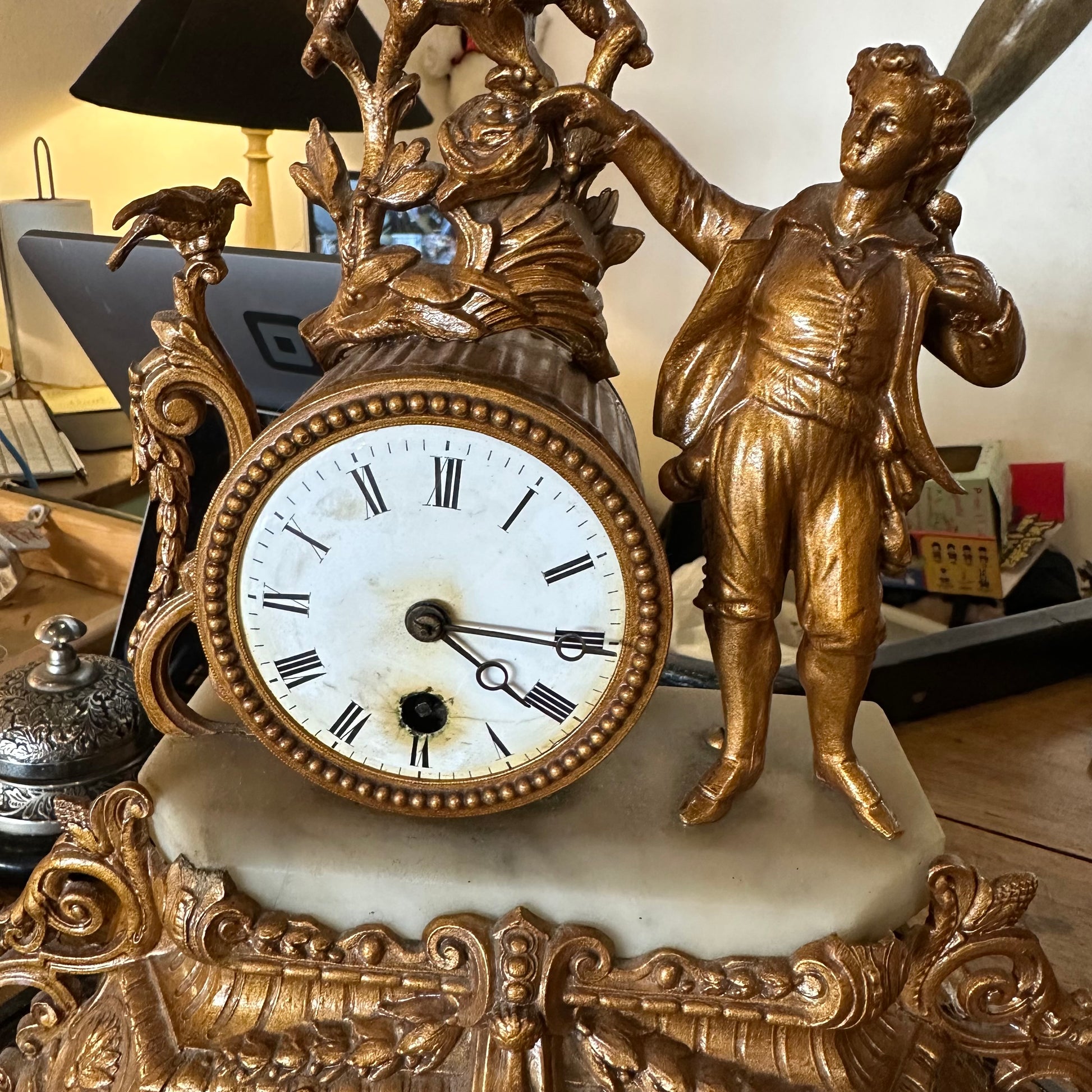 Late 19th-century French figural mantel clock in ornate Rococo Revival style, featuring a gilt spelter young gentleman with floral garland, white marble base, and original mechanical movement. The drum-shaped housing still contains the movement and pendulum assembly, though the dial and bezel are missing. Ideal for restoration or display, this piece showcases the charm and craftsmanship of French decorative clocks.