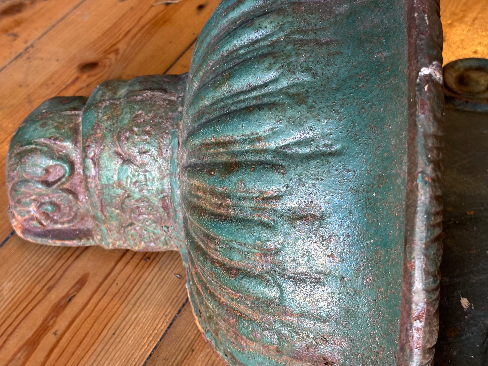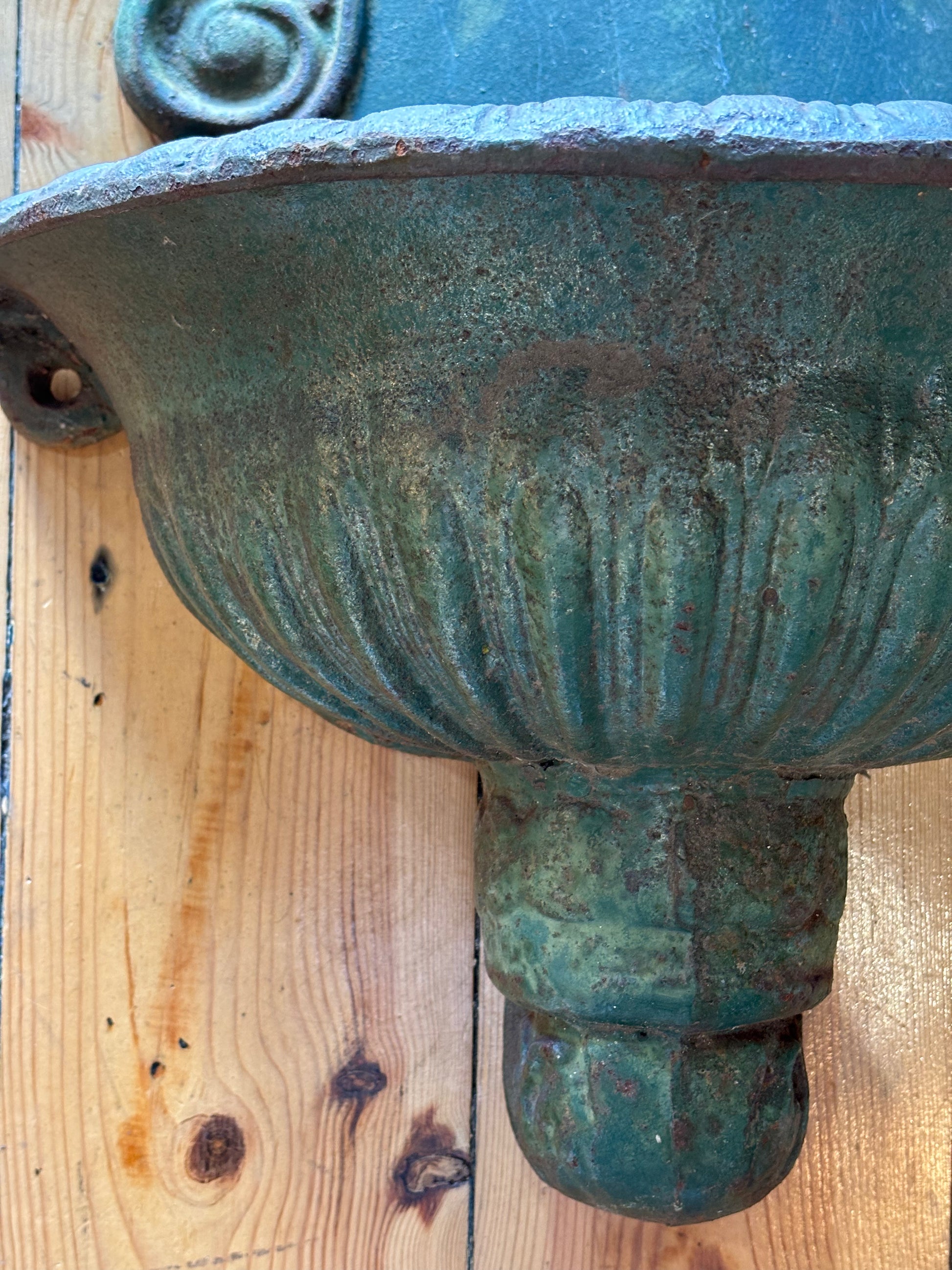 A majestic example of late 19th to early 20th century European garden décor, this heavy cast iron wall-mounted fountain features a striking lion’s head spout and richly detailed scrollwork. With its original aged green patina and timeworn charm, it’s perfect for adding character to an outdoor courtyard, garden wall, or even as a sculptural statement indoors.