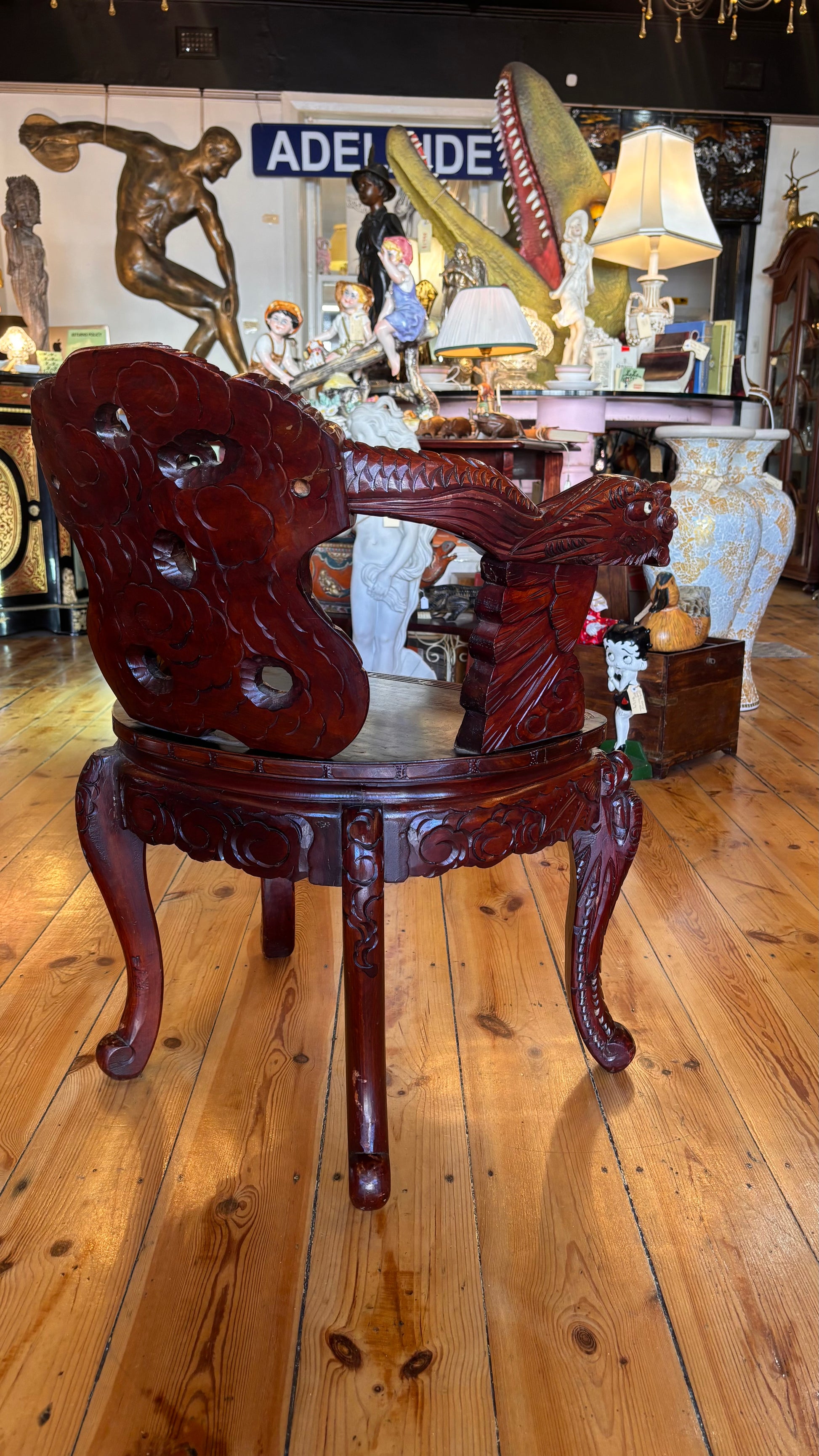 Command attention with this spectacular antique Chinese-style dragon throne chair, masterfully hand-carved from solid hardwood. Standing approx. 80cm high, this ornate armchair features richly detailed dragons on the arms, a phoenix or qilin-style mythical creature on the backrest, and stylised cloud motifs throughout—each element painstakingly sculpted with incredible craftsmanship.