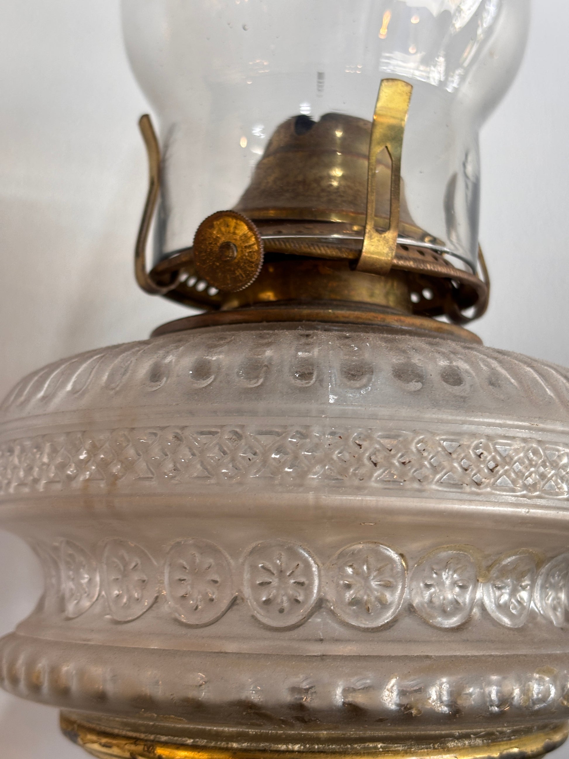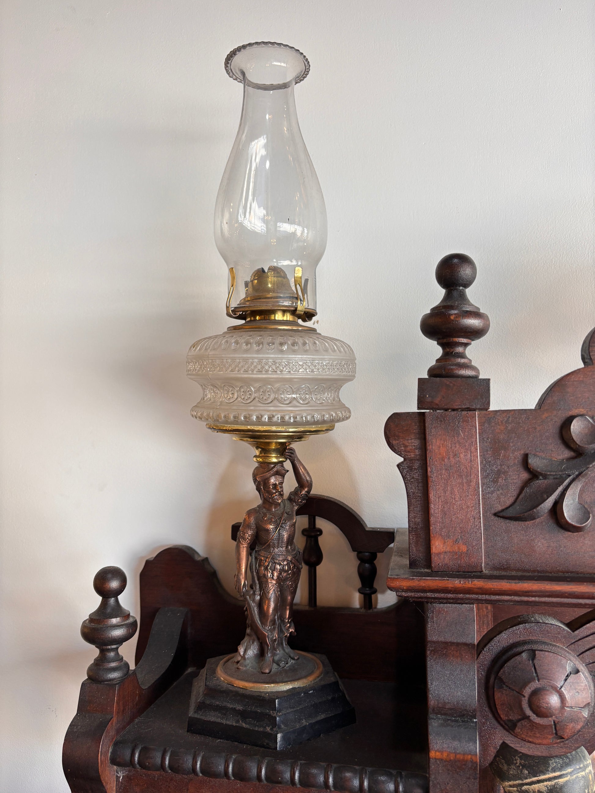 Decorative late-19th to early-20th century figural oil lamp featuring a well-modelled spelter (zinc alloy) figure supporting a patterned pressed-glass font. Complete with brass burner and clear glass chimney, this piece has strong Victorian/Edwardian character and pleasing proportions.