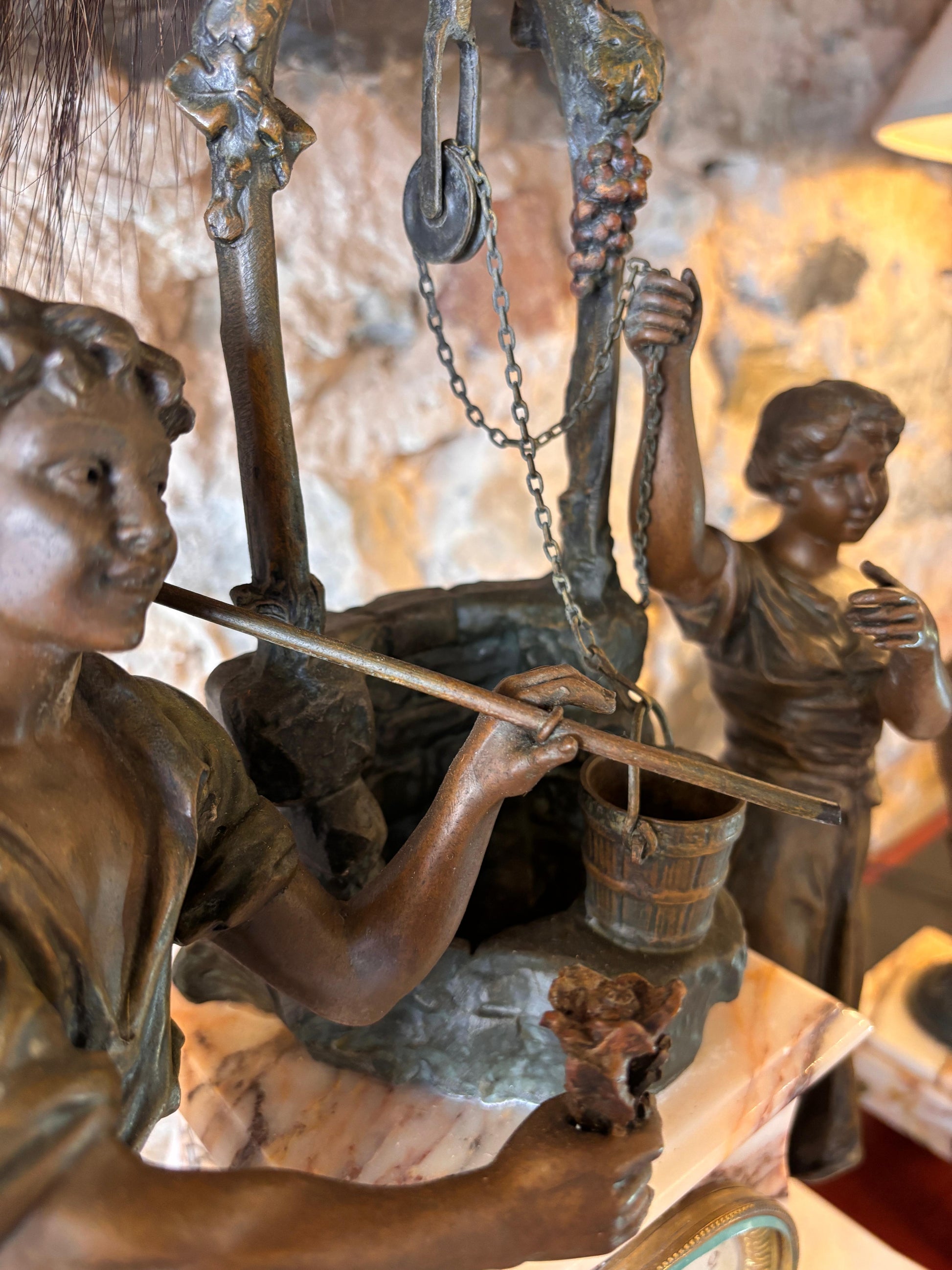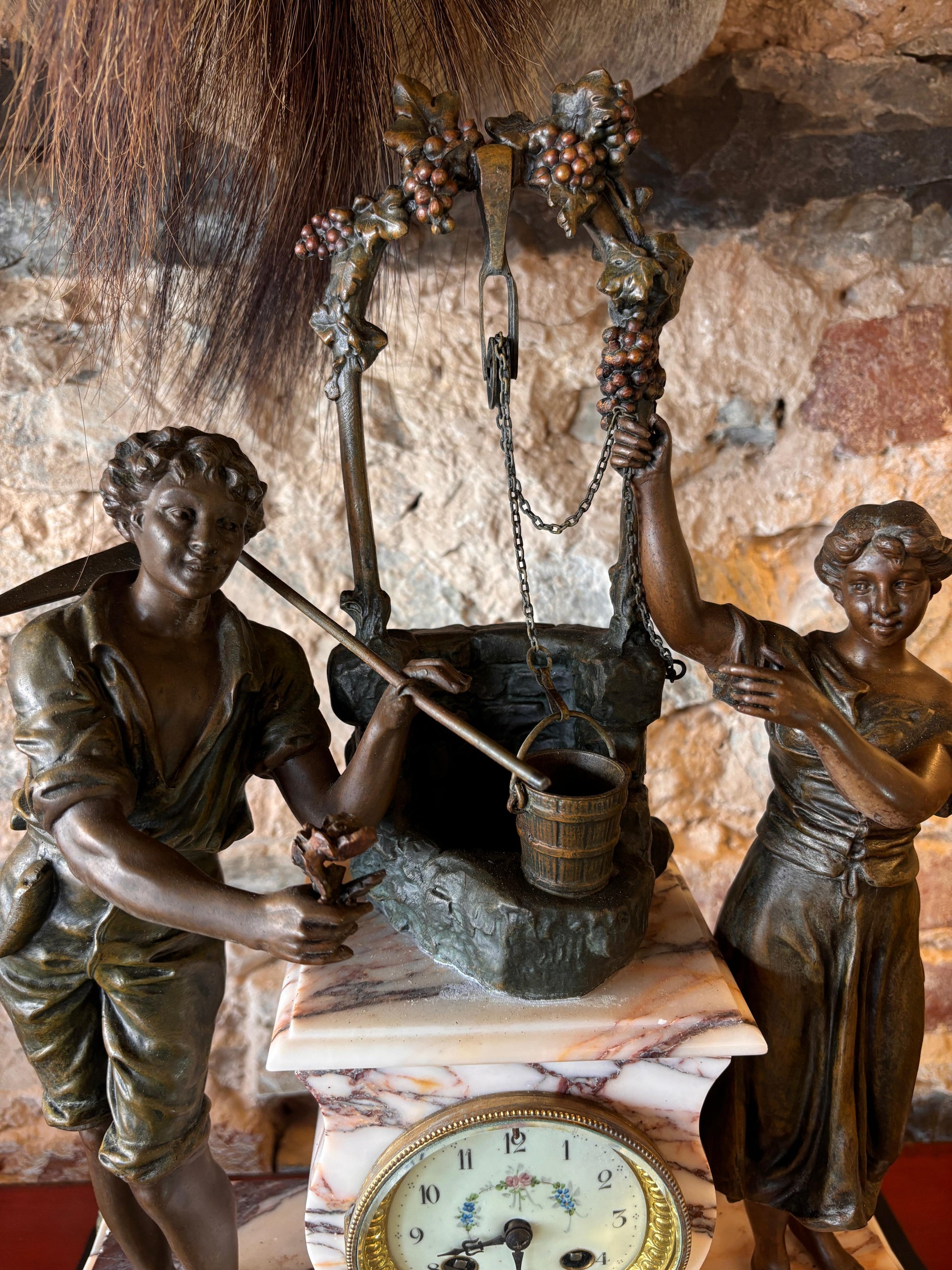 French Antique Marble Figural Clock Garniture – “Rencontre au Puits” by E. Groleau c.1890 – SCAPH Cluses Movement (Not Running)