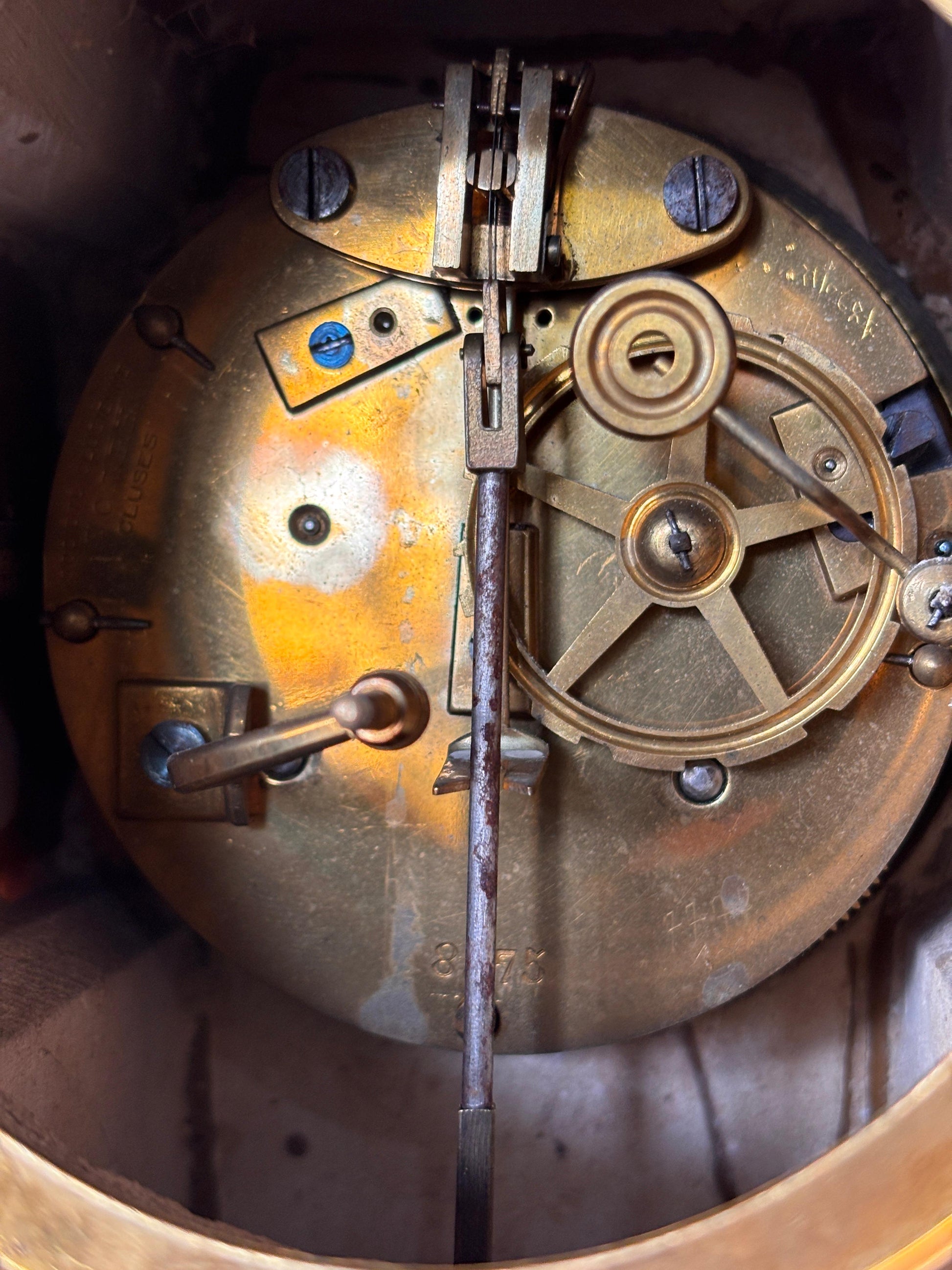 The movement currently does not run and will require a standard service/cleaning by a clockmaker. Plates, escapement and strike components are intact. Cosmetically excellent for its age with beautiful patina to metalwork and vibrant marble.