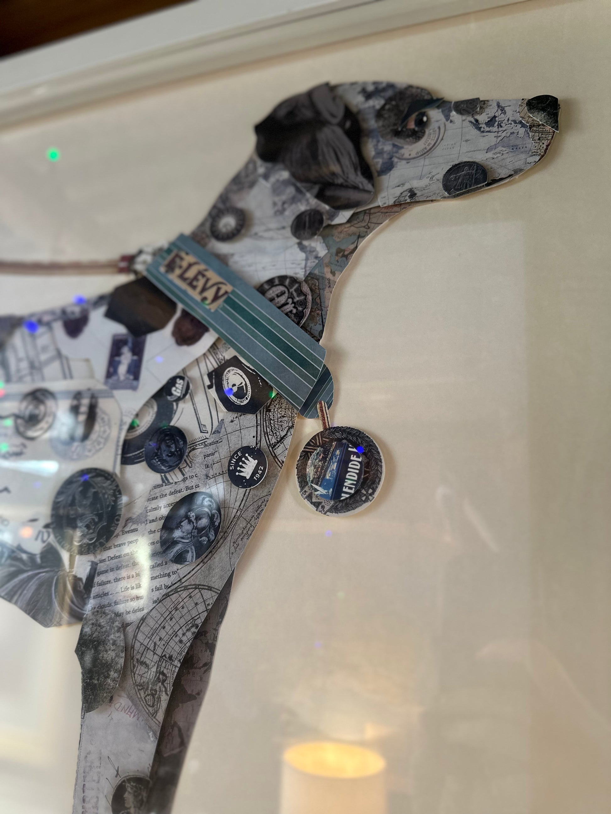 Guan Sheng Large Framed Dog Collage Art – Mixed Media Pointer Greyhound Silhouette – Vintage Ephemera Wall Art