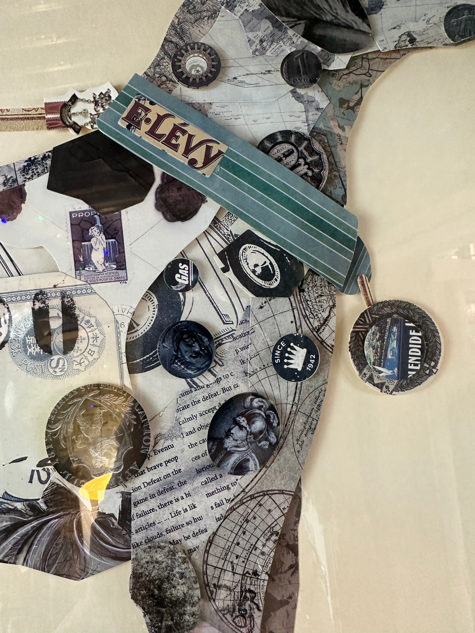 Look closely to discover a world of history within the frame: antique maps, 1940s postage stamps, calligraphic manuscripts, vintage newspaper clippings, and retro "Gas & Oil" advertisements. The artist’s use of layered monochrome tones with subtle pops of colour gives this piece a timeless, "museum-curiosity" aesthetic that fits perfectly in Mid-Century Modern, Industrial, or Eclectic interiors.