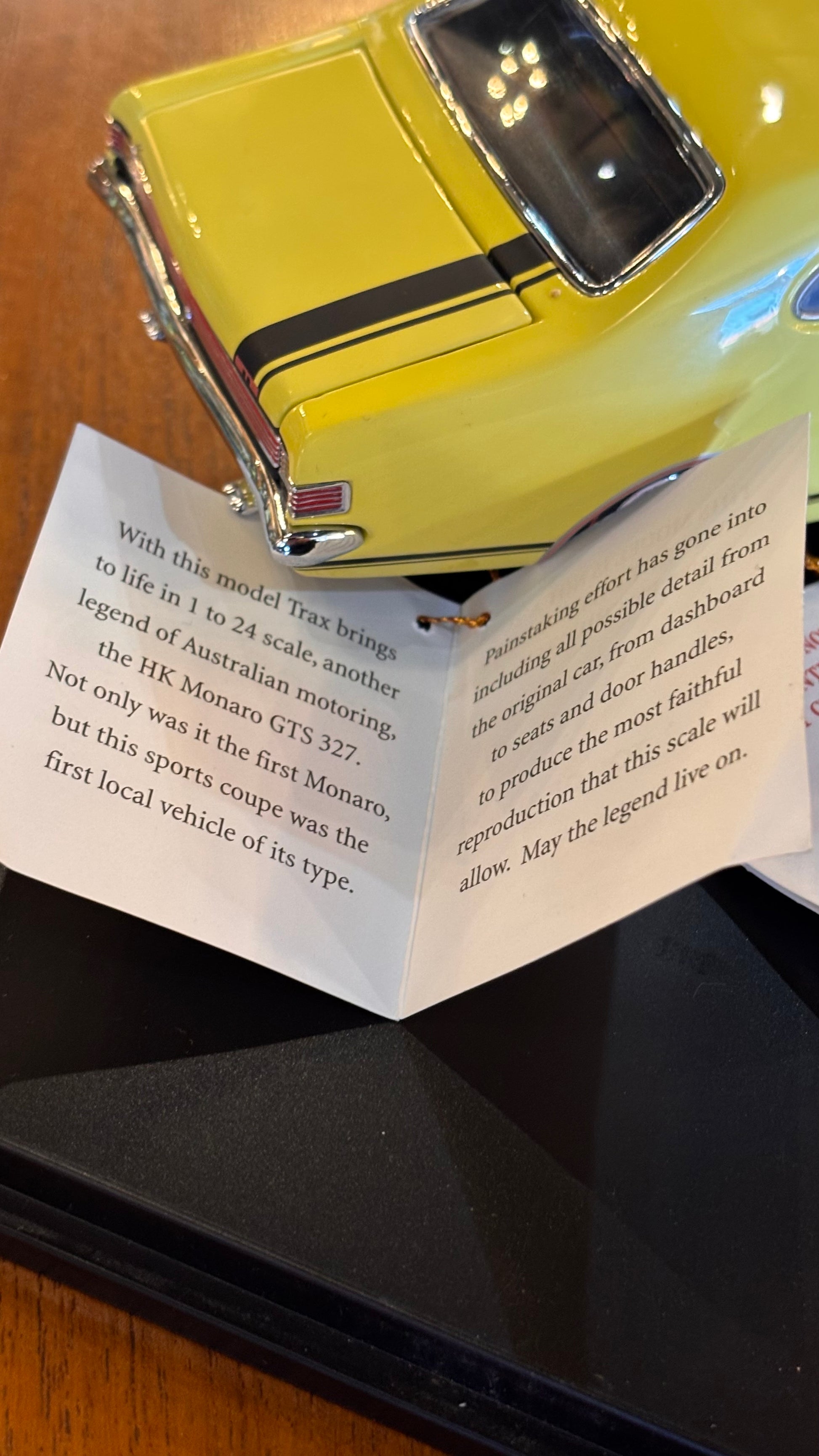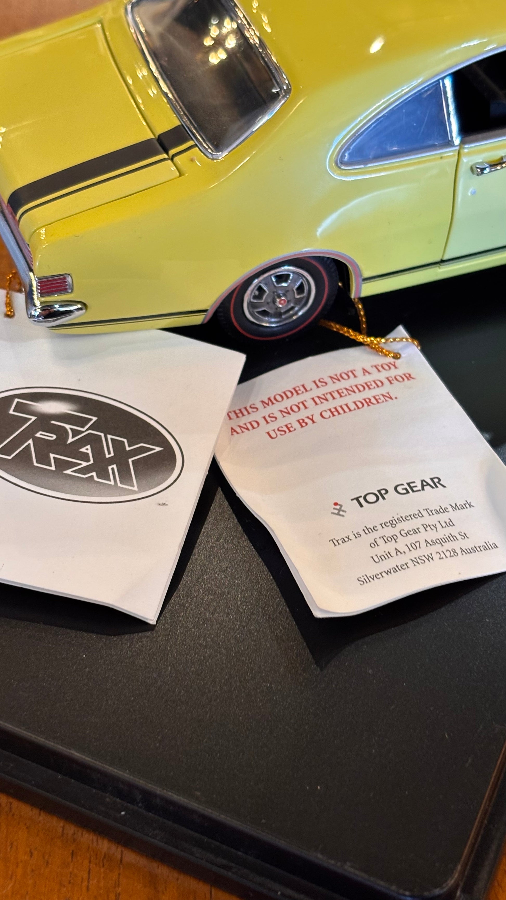 Celebrate the golden era of Aussie muscle with this detailed 1:24 scale die-cast model of the iconic Holden Monaro GTS 327, finished in striking yellow with black rally stripes. Produced by Trax for adult collectors, this high-quality piece features authentic detailing, original documentation, and comes in its clear display case.