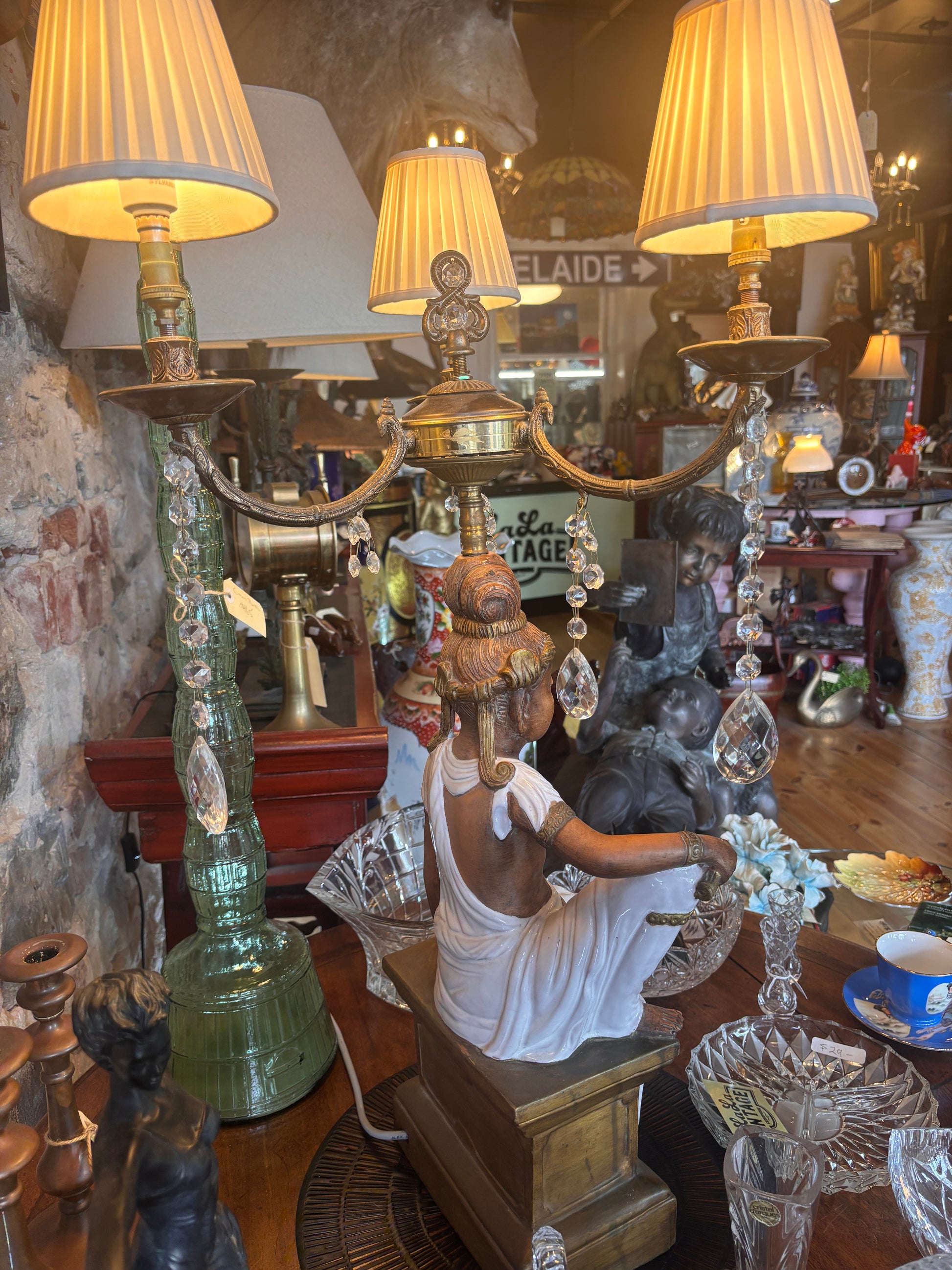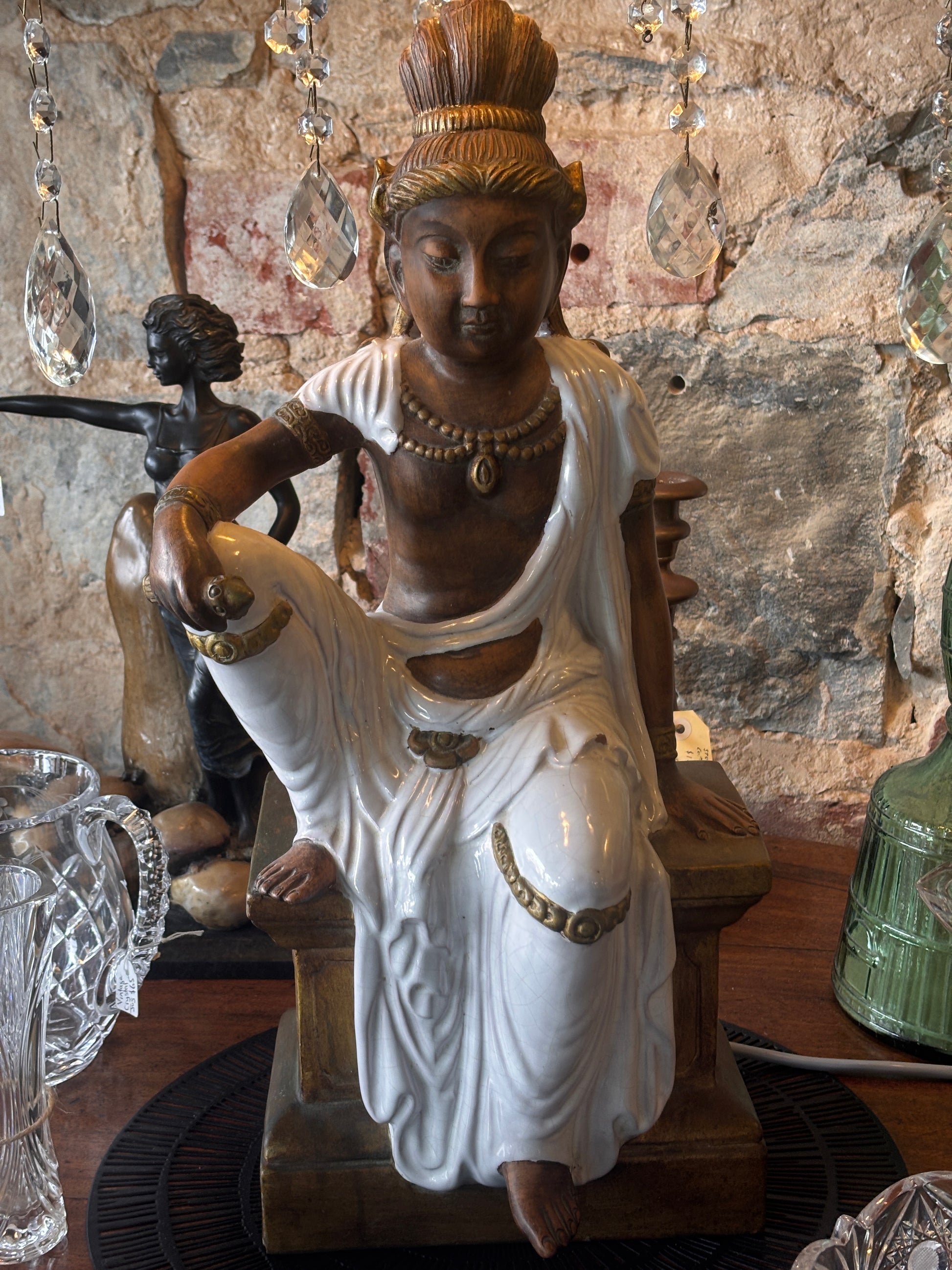 Large and visually striking figural table lamp depicting a seated female figure in an Orientalist style, modelled in glazed ceramic (possibly terracotta body with glaze) and mounted with a three-arm brass candelabra. Each arm is dressed with faceted crystal drops, producing a warm, refracted light.