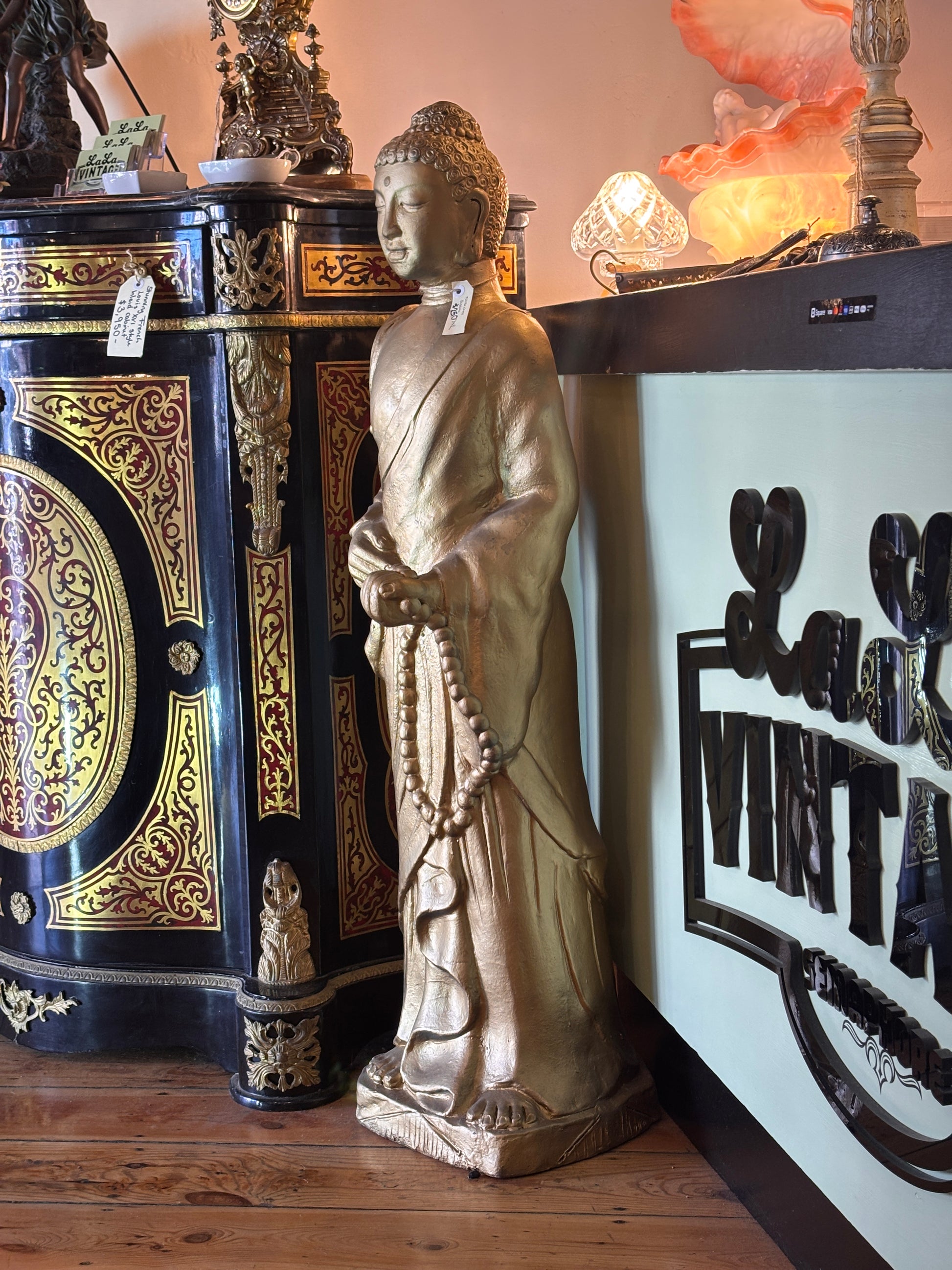 Large decorative standing Buddha statue, approx 110 cm tall, made from terracotta with gold-painted finish. Features stylised hair curls, calm facial expression, flowing robe, and prayer beads. Suitable as a statement interior piece for a home, shop display, or meditation space.