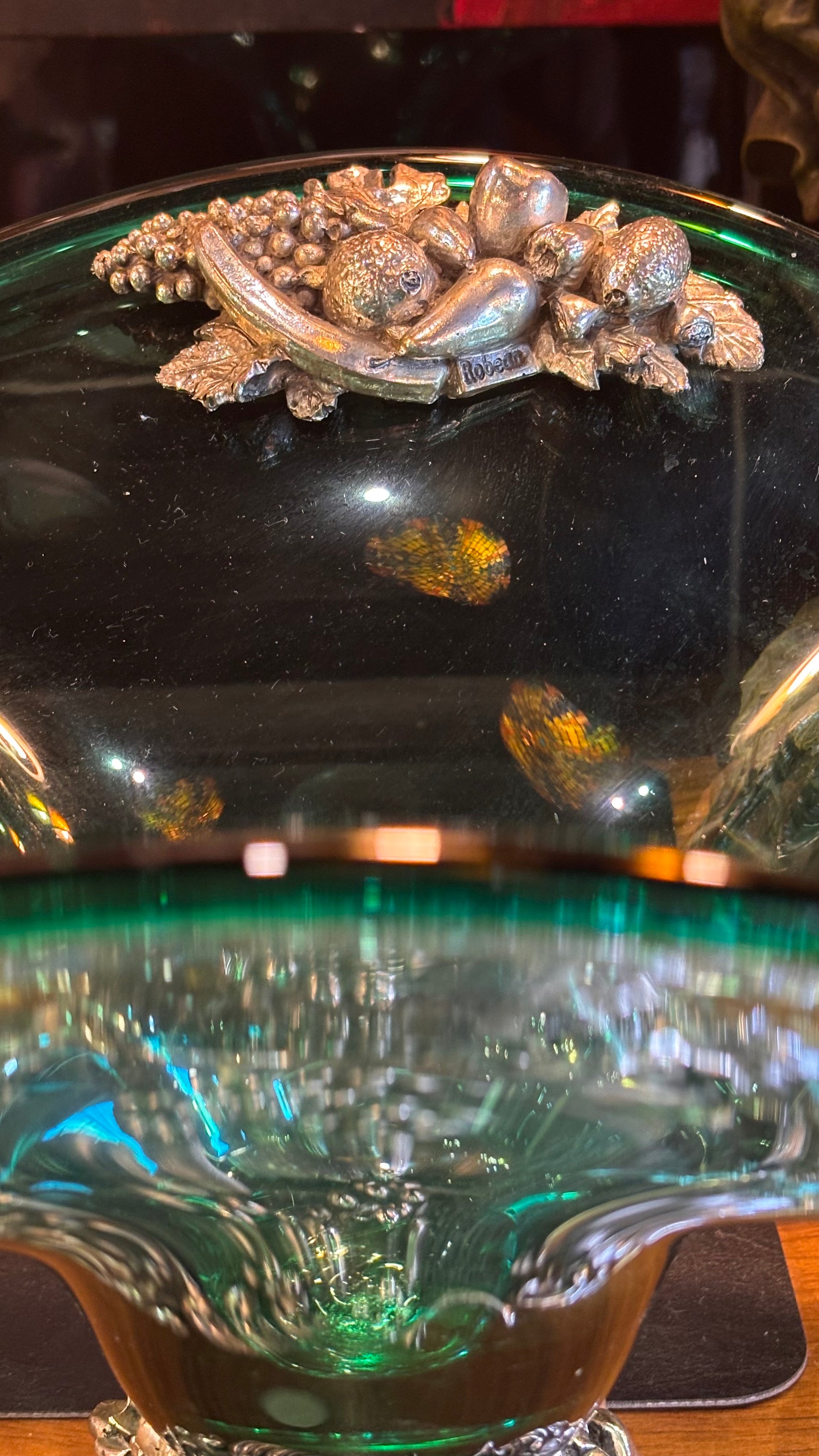 Vintage Italian Green Glass Centerpiece Bowl with Silver Base – Robean – Handcrafted Rococo Style, 35cm
