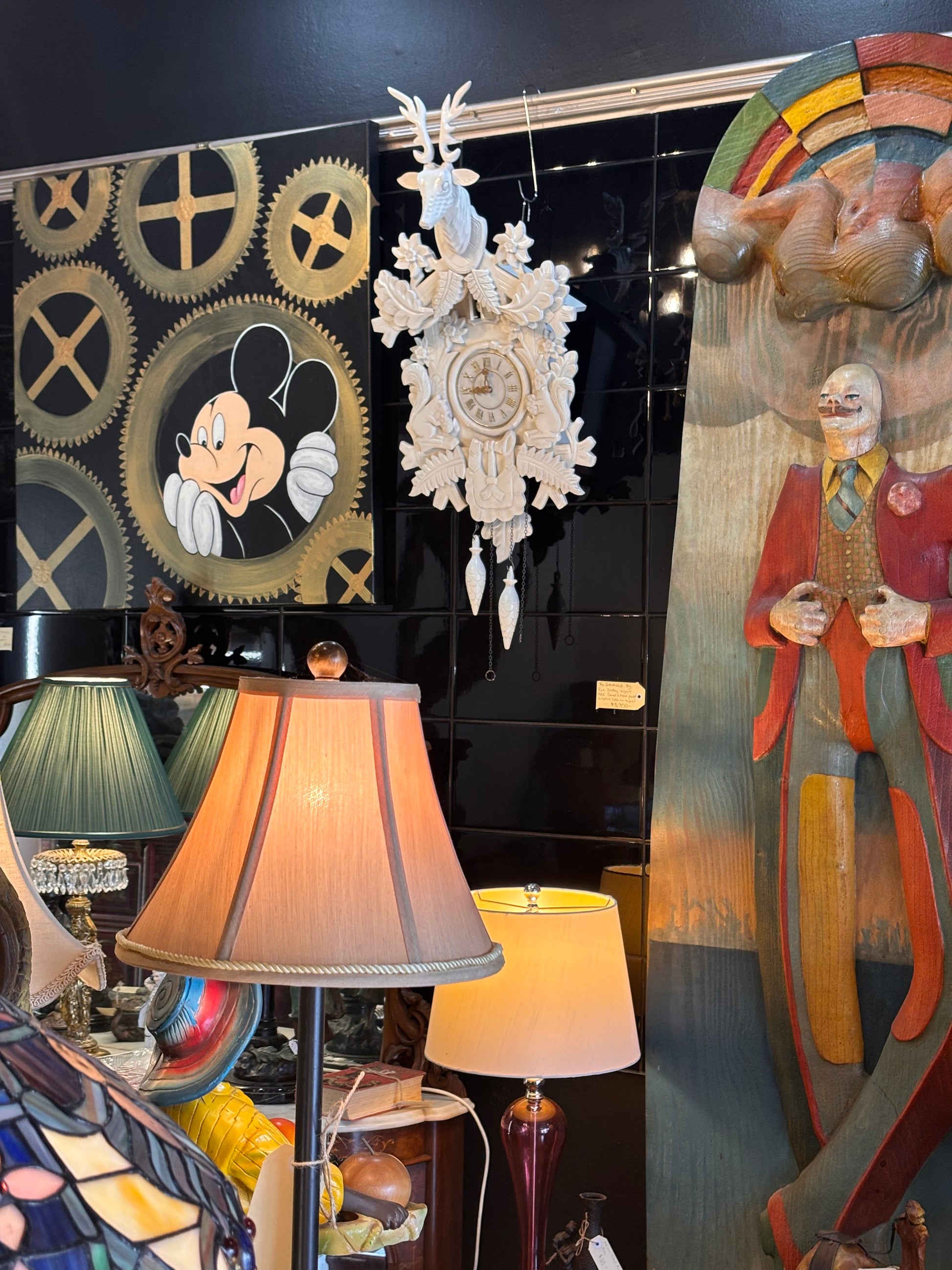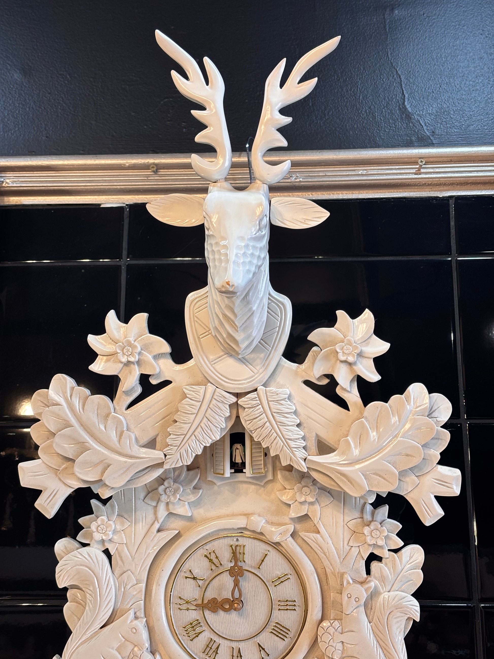 This striking modern vintage cuckoo clock reimagines the traditional Black Forest design with a fresh, contemporary edge. Standing an impressive 90 cm tall as displayed and 40 cm wide, it features a beautifully detailed stag head with antlers, surrounded by finely modelled leaves, flowers, and woodland animals.
