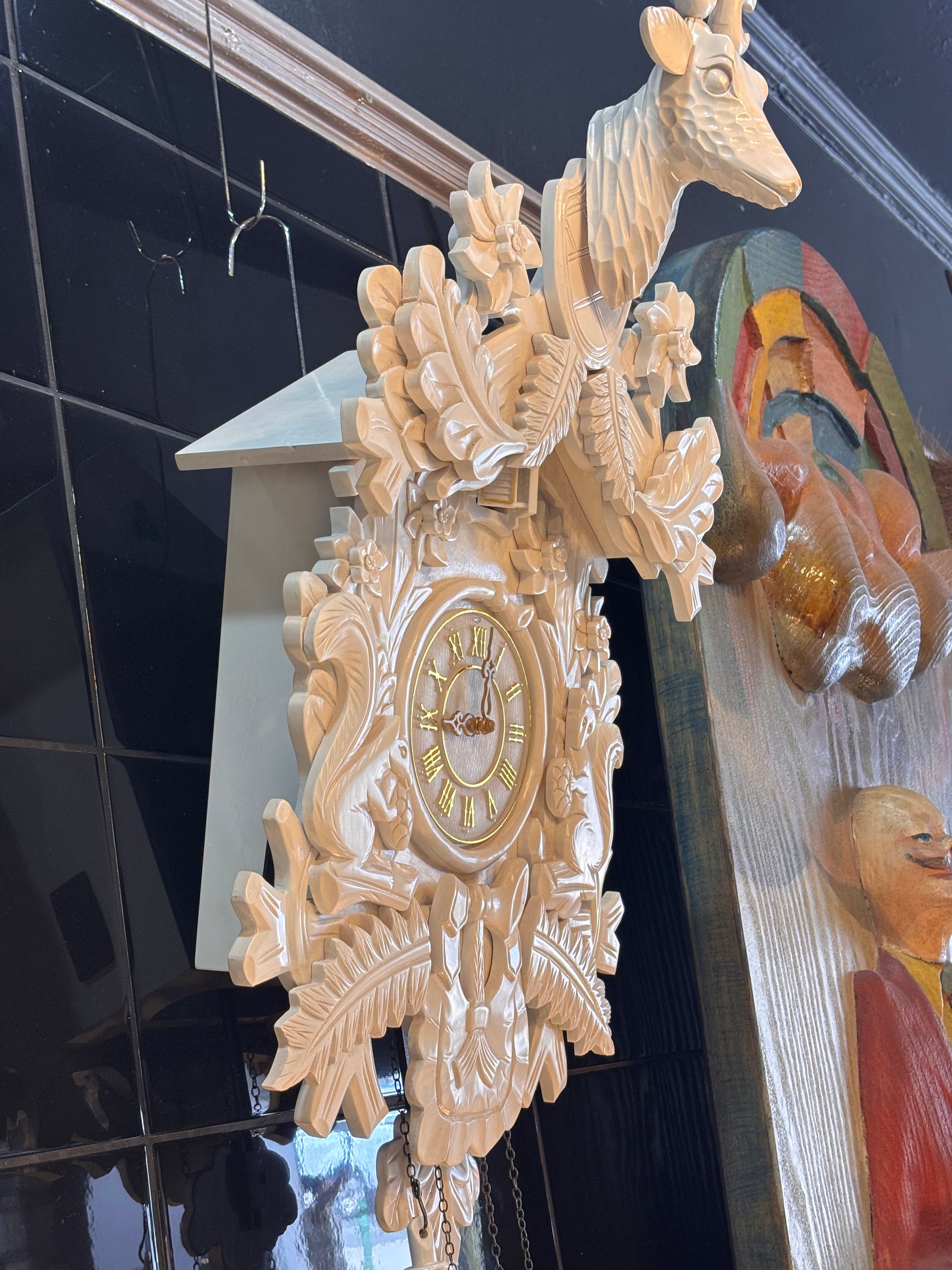 Large Modern Vintage White Stag Cuckoo Clock – Hand-Carved Chalet Style Wall Clock (approx 90 cm)