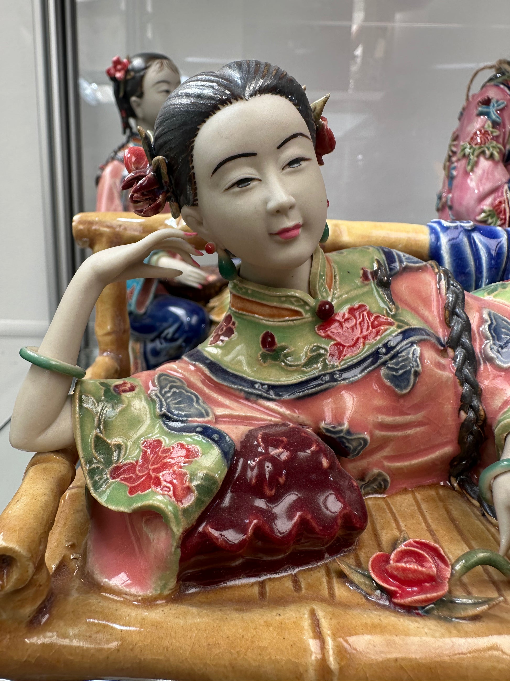 Lin Weidong Signed Shiwan Porcelain Figurine - Reclining Lady on Bamboo Bed - Vintage Chinese Wucai Ceramic Art