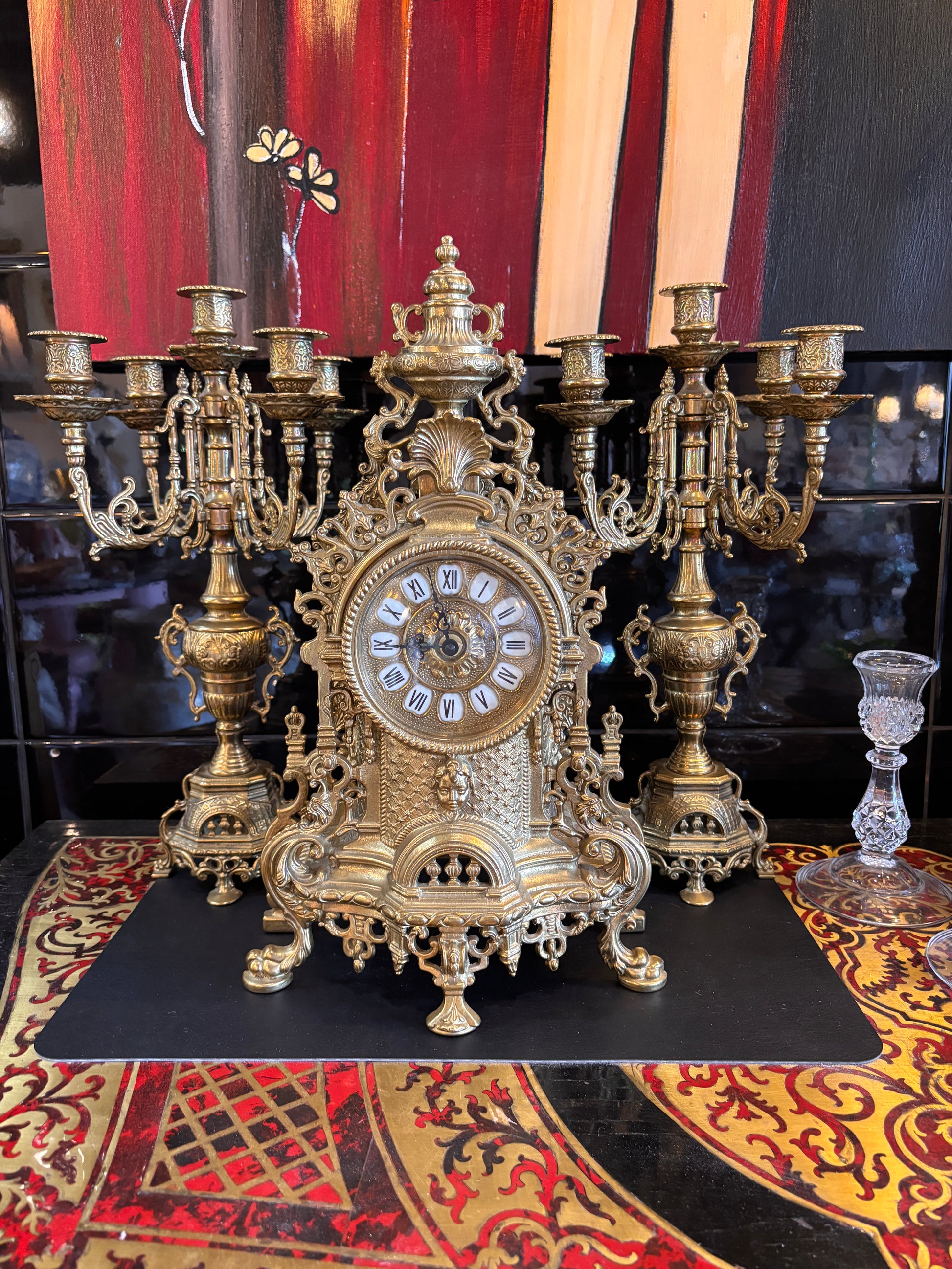 Includes: Mantel clock with matching pair of candelabras