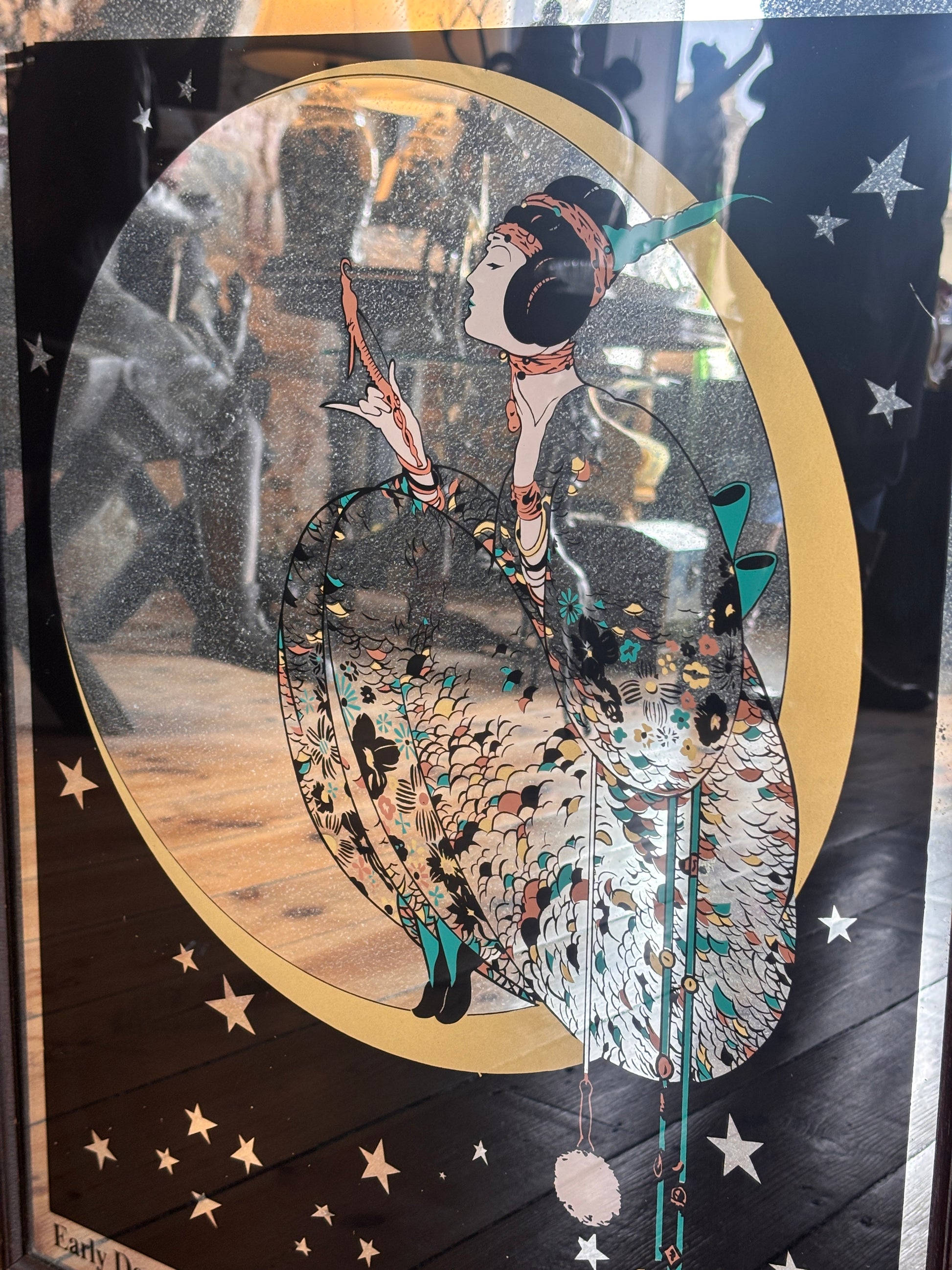 The softly foxed mirror surface creates depth and character, enhancing the Art Deco fashion illustration with a dreamy, timeworn quality that cannot be replicated. Elegant lines, stylised costume details and celestial motifs evoke the golden age of early 20th-century fashion illustration, while the natural ageing of the mirror lends warmth and authenticity.
