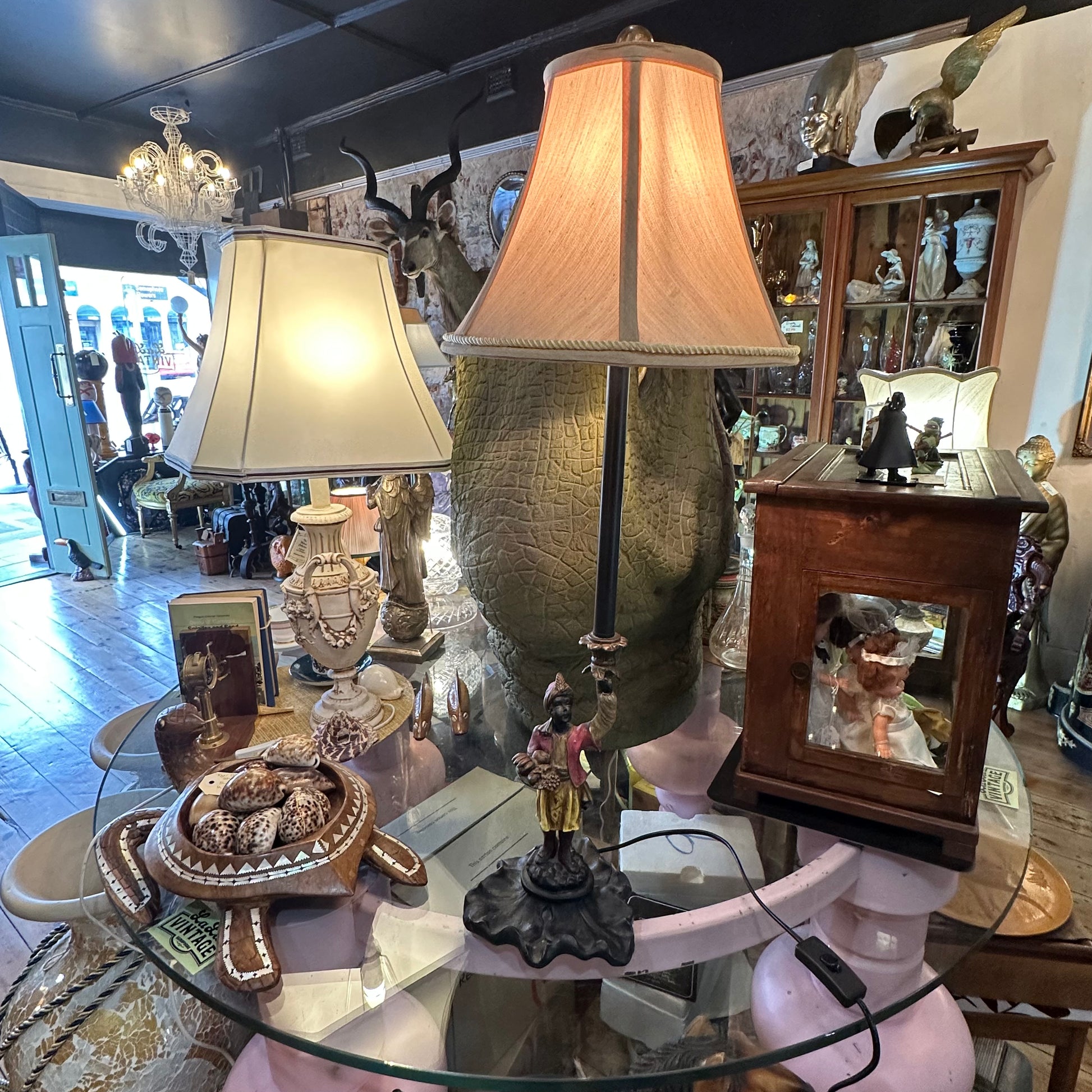 This piece is in the Hollywood Regency style, drawing on the decorative revival of exotic motifs that were popular in the mid-20th century. It has a sculptural presence that makes it ideal as a statement lamp in a lounge, entryway, or eclectic interior.