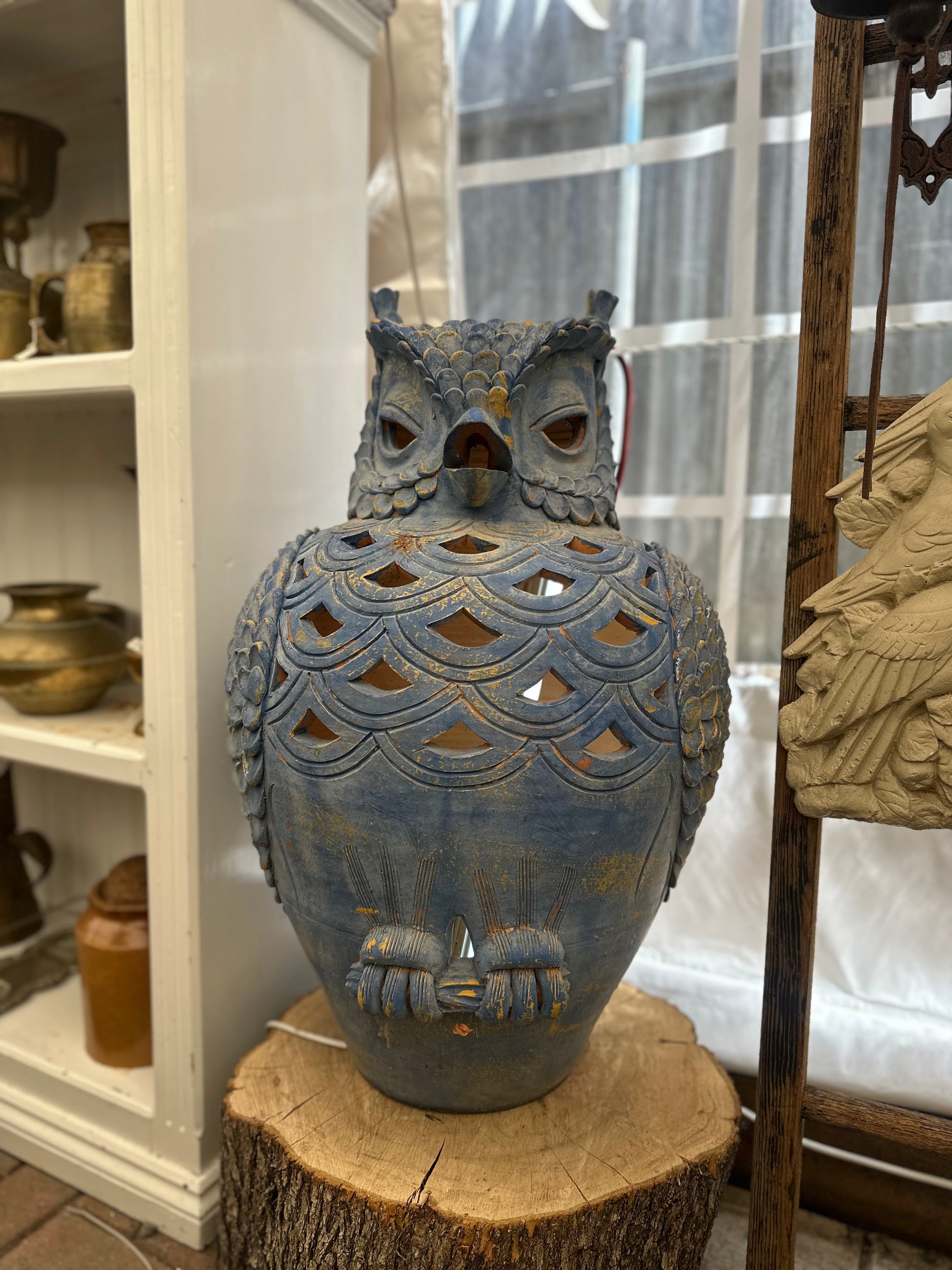 Vintage Blue Glazed Terracotta Owl Lantern