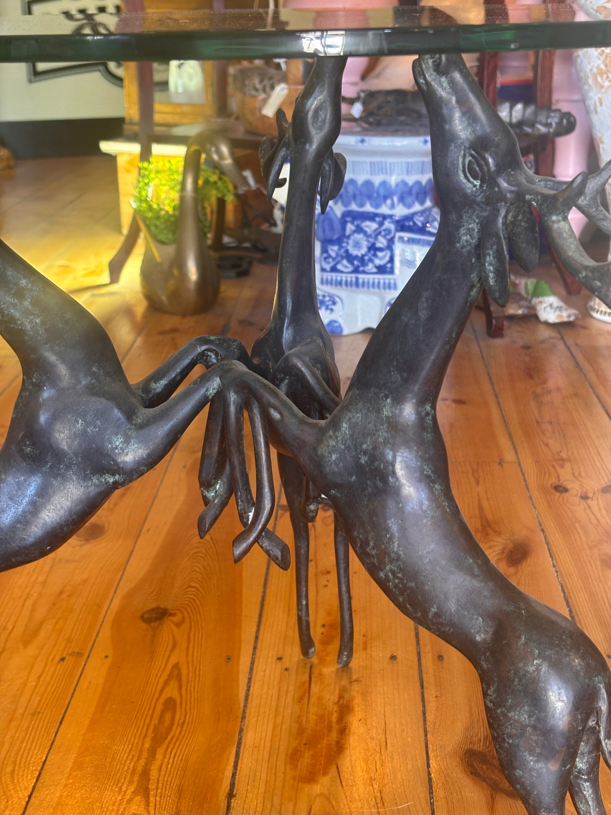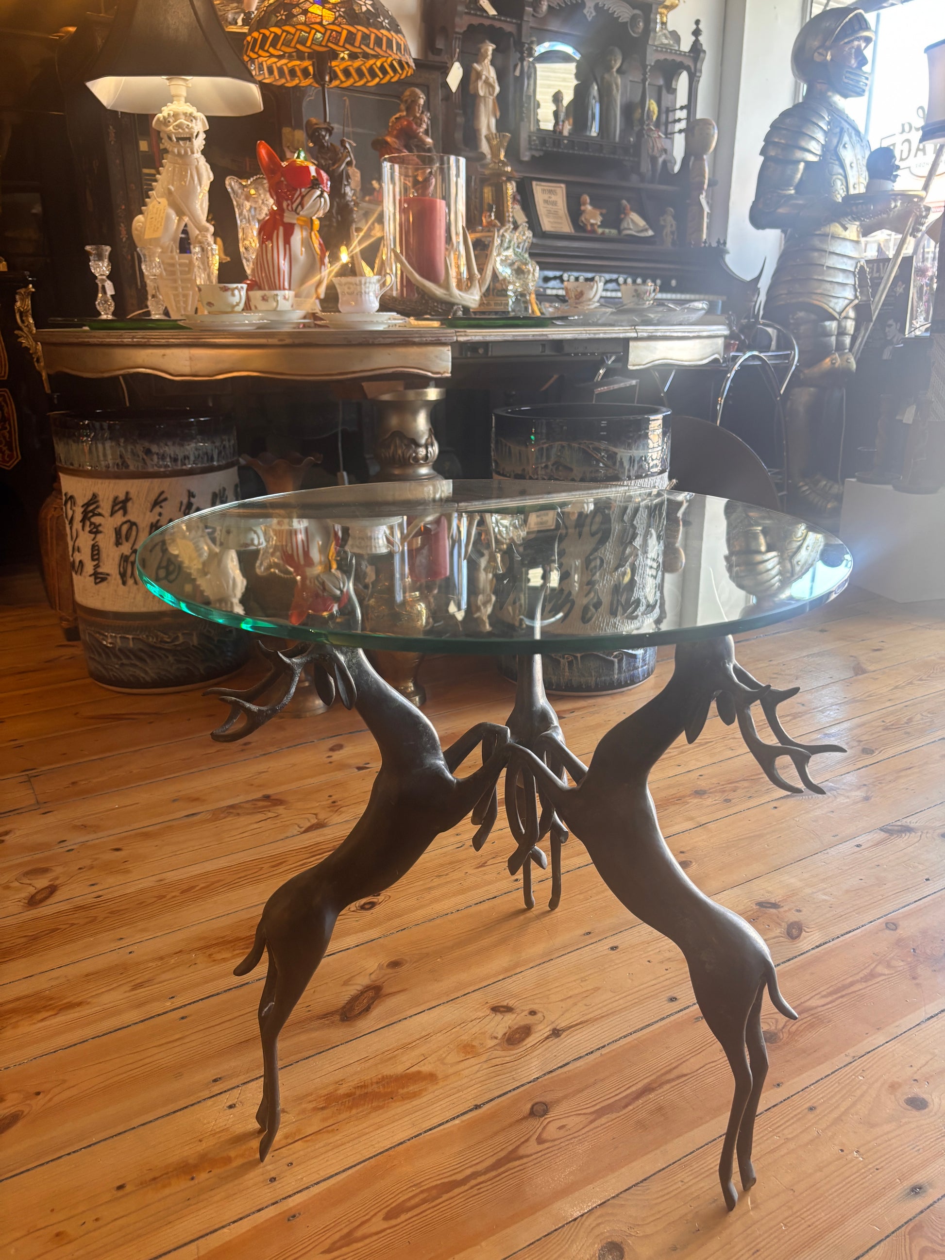 Striking sculptural coffee / occasional table featuring a cast bronze base formed by three rearing deer, supporting a circular thick glass top. The figures are finely modelled with elongated legs and expressive antlers, creating a dynamic tripod base with strong visual presence from all angles.