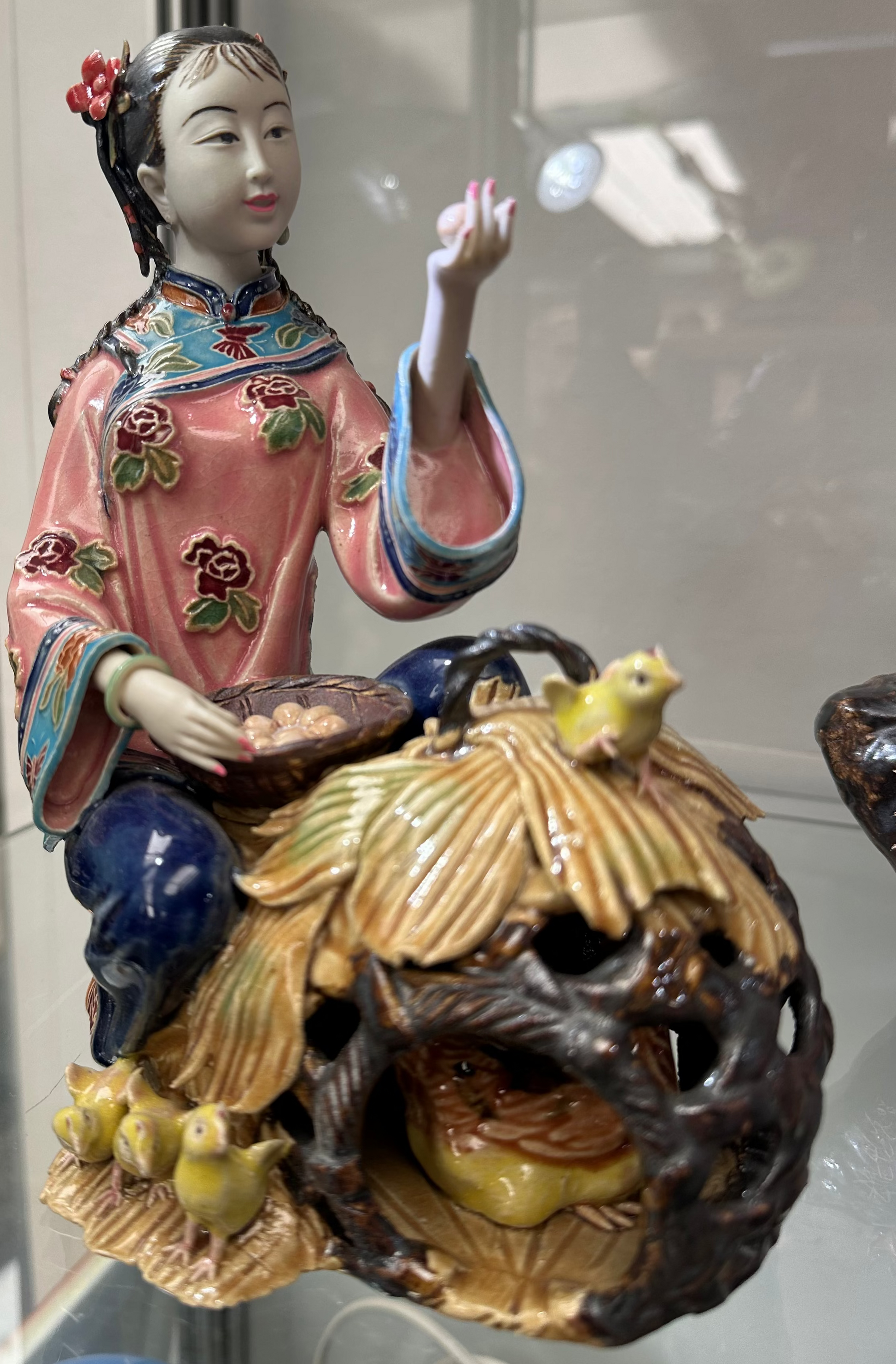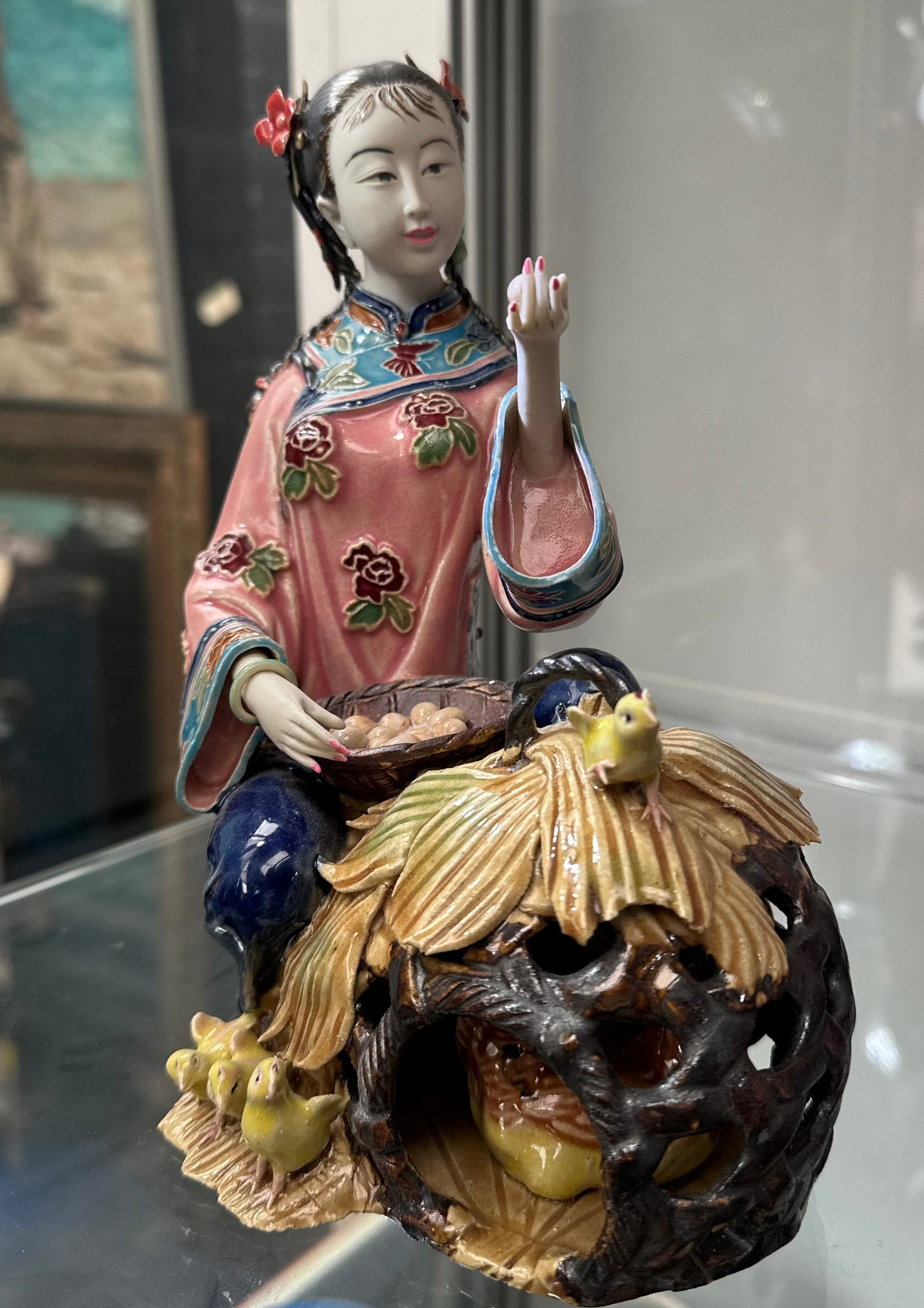 Vintage Chinese Shiwan Pottery Figurine - Lady Feeding Chickens & Eggs - Hand-Painted Polychrome Ceramic Statue