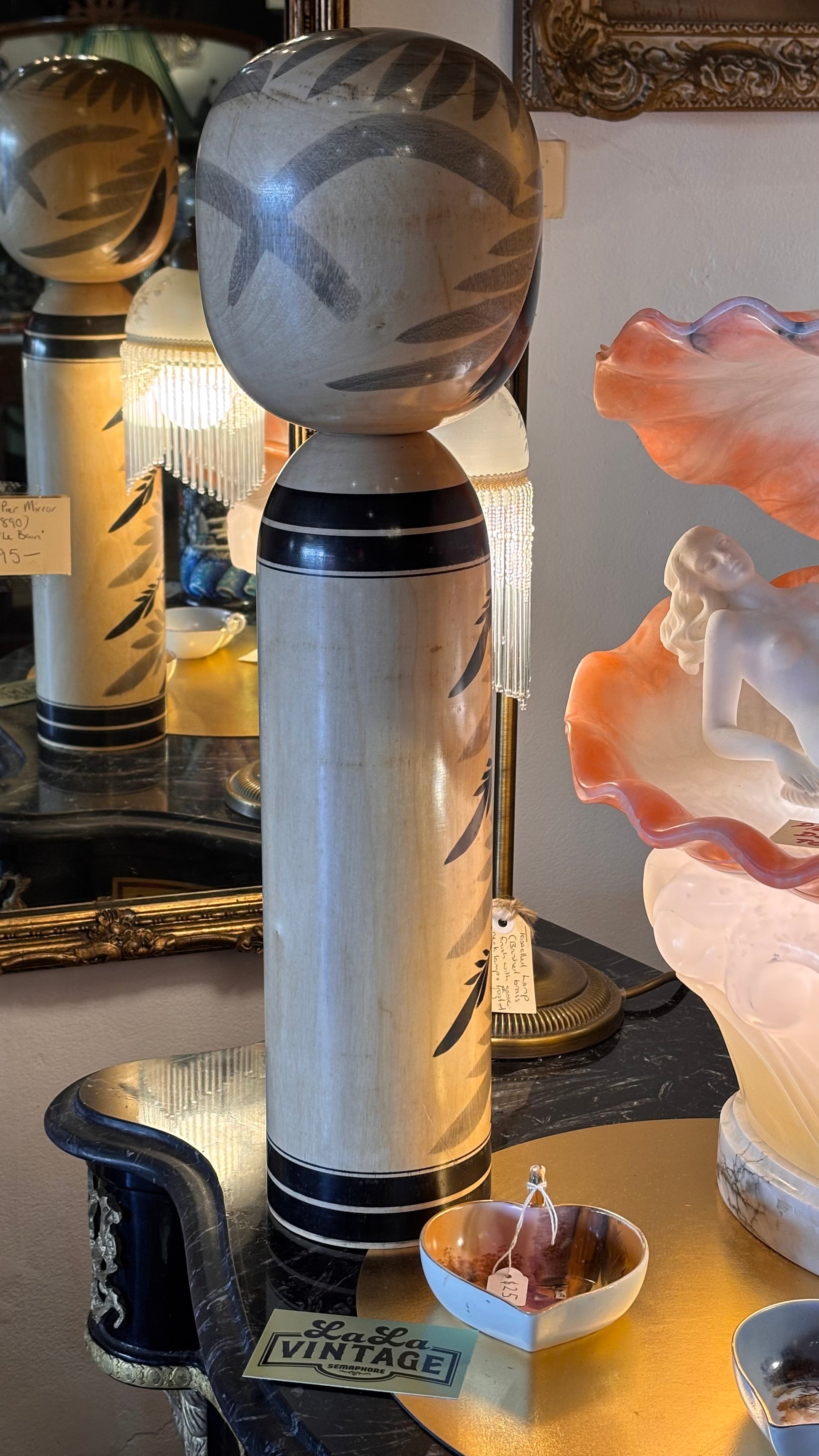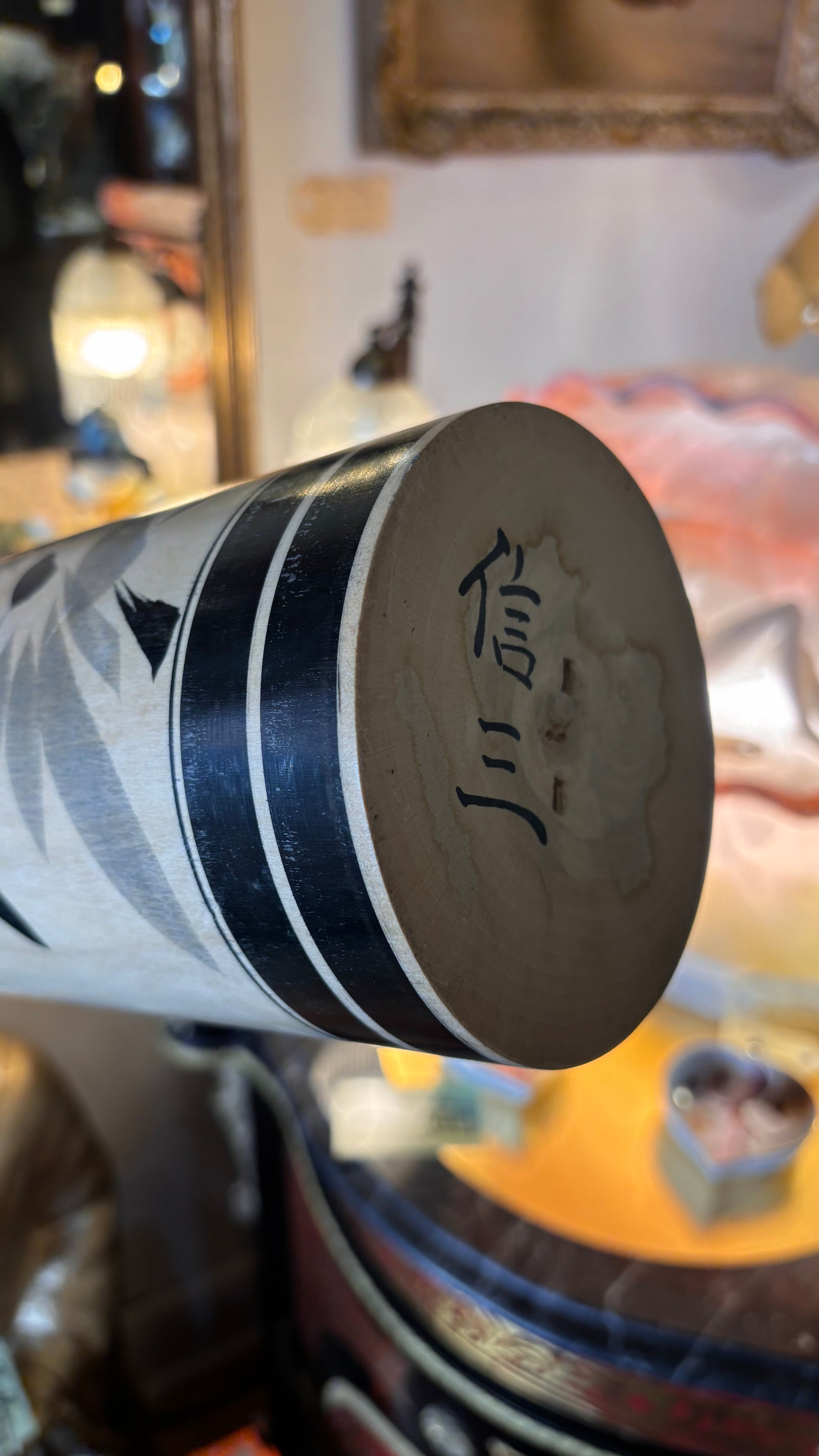 Handcrafted in Japan’s Tōhoku region, this 54cm-tall Kokeshi doll embodies elegant restraint. Decorated with soft black floral motifs and signed by master artisan Shinzō (信三), its serene face and minimalist palette make it both a collector’s item and a striking decorative piece.