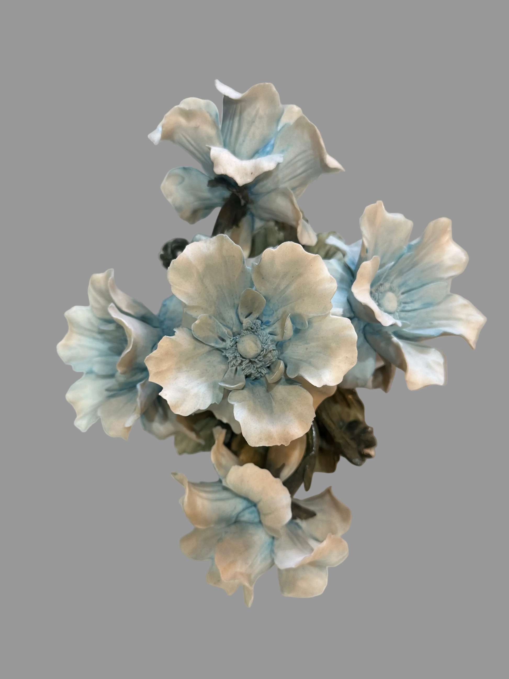 Enhance your home with this vintage porcelain floral sculpture, a beautifully detailed bouquet designed in classic European porcelain style. Featuring delicate hand-painted blossoms with soft blue and cream tones and realistic botanical form, this piece adds timeless elegance to shelves, cabinets, mantelpieces, or as part of a curated décor vignette.