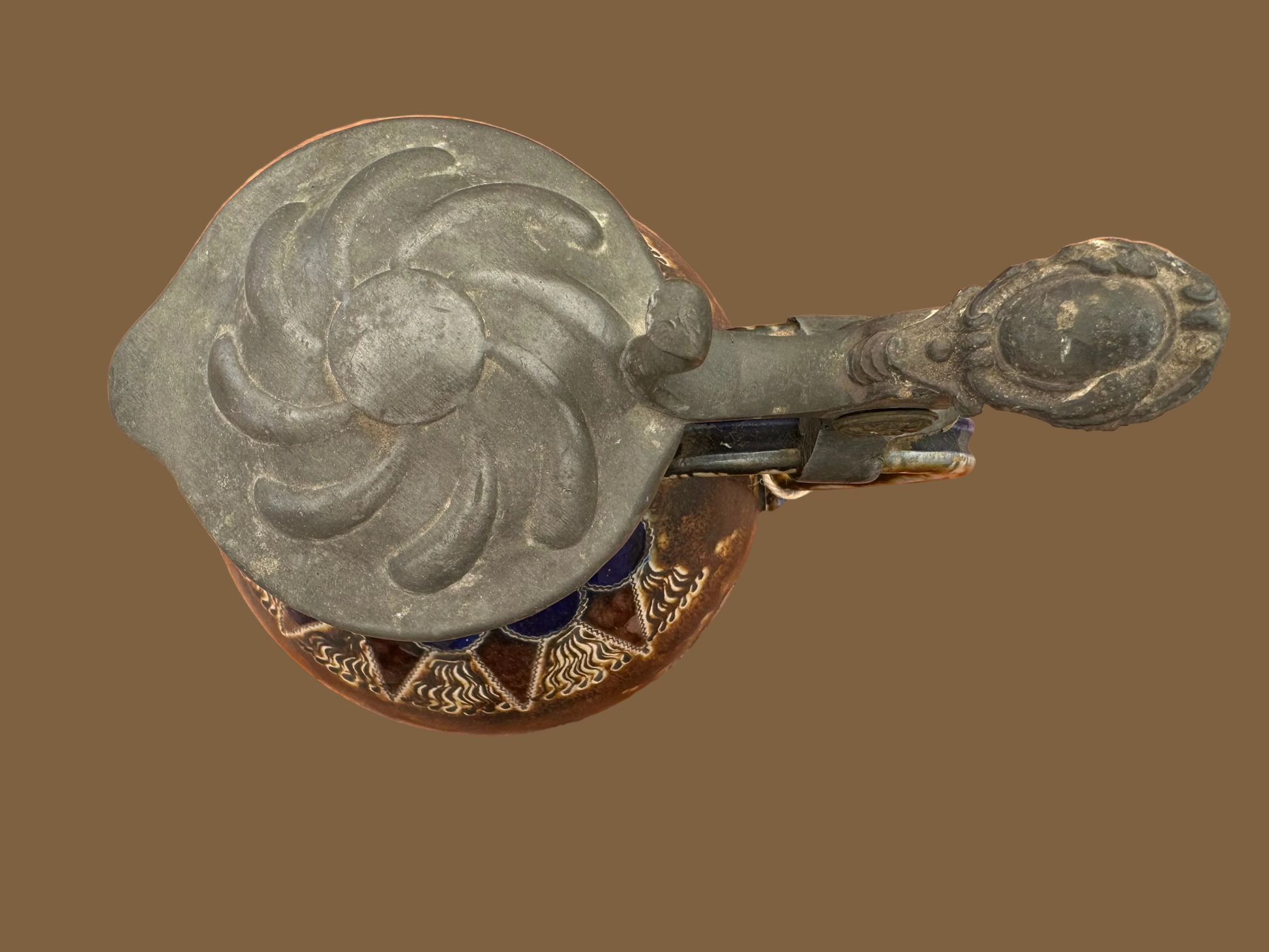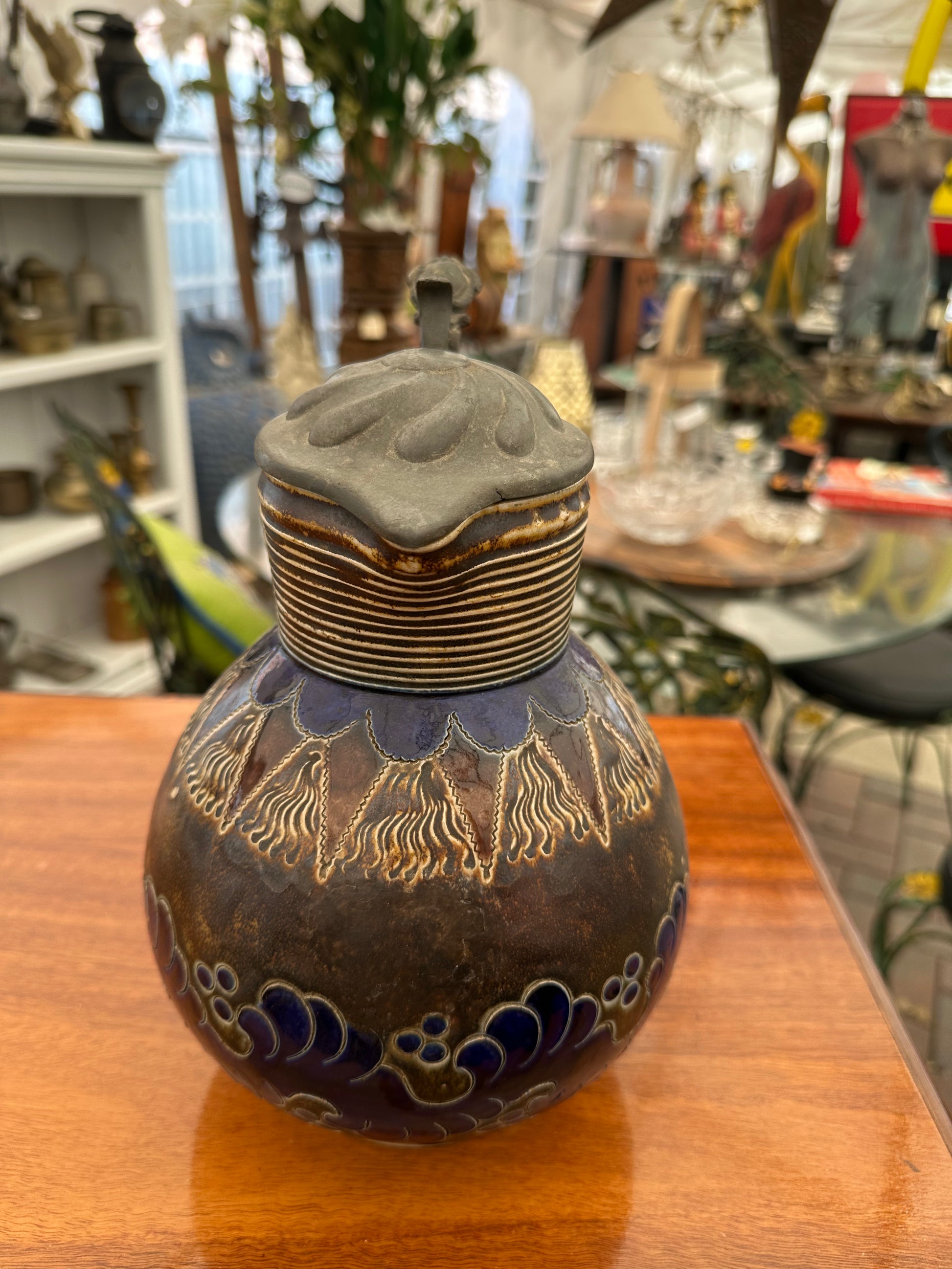 This striking vintage Reinhold Merkelbach Handgeritzt ceramic lidded jug is an excellent example of high-quality German stoneware. Hand-incised and salt-glazed in the classic Westerwald tradition, this piece features fine detail, rich earthy tones, and a decorative pewter-style lid. A functional and decorative item, it’s ideal for collectors of European ceramics, breweriana, or artisanal pottery.