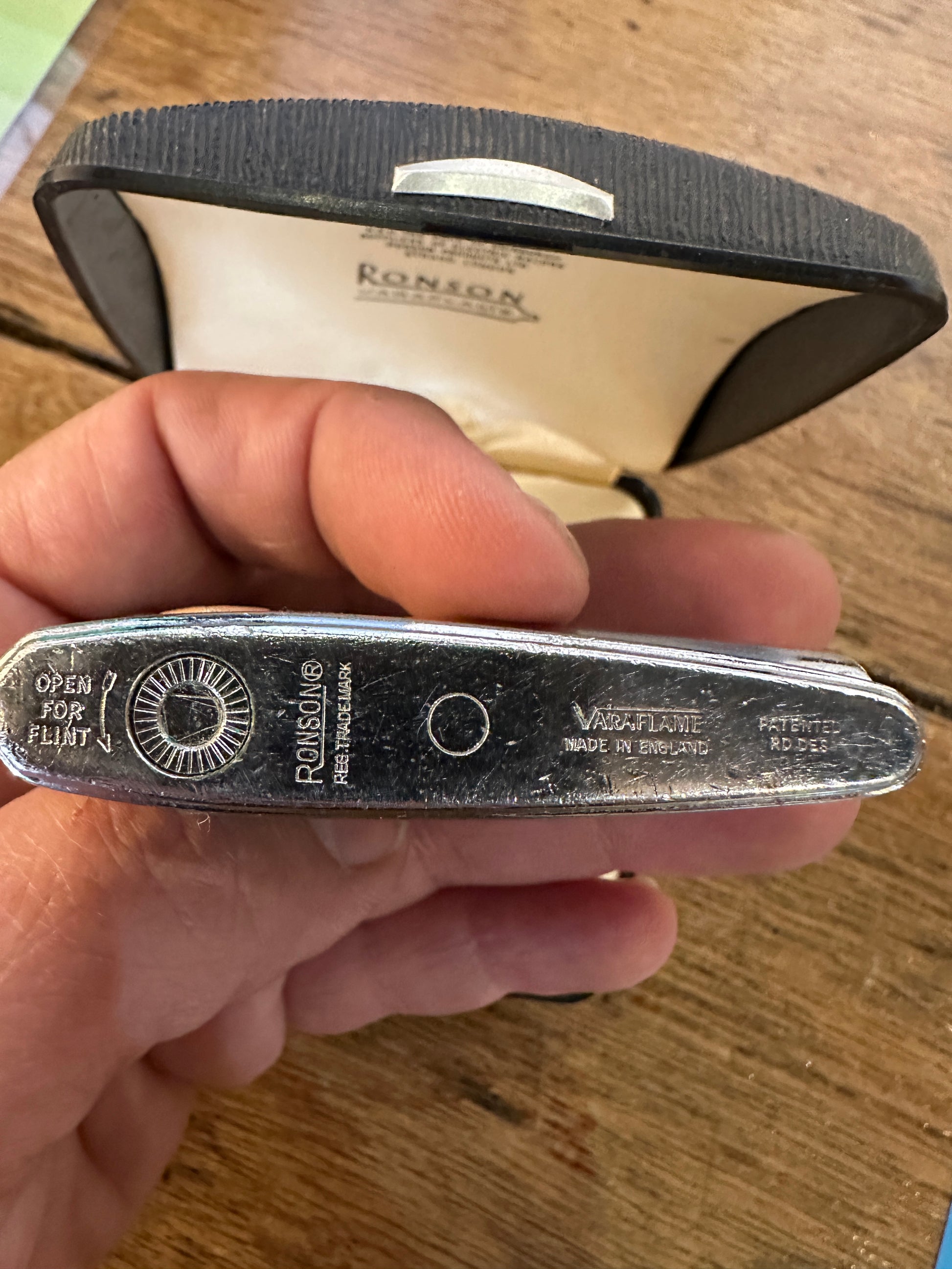 Vintage Ronson Varaflame butane lighter, displayed in its original presentation case.