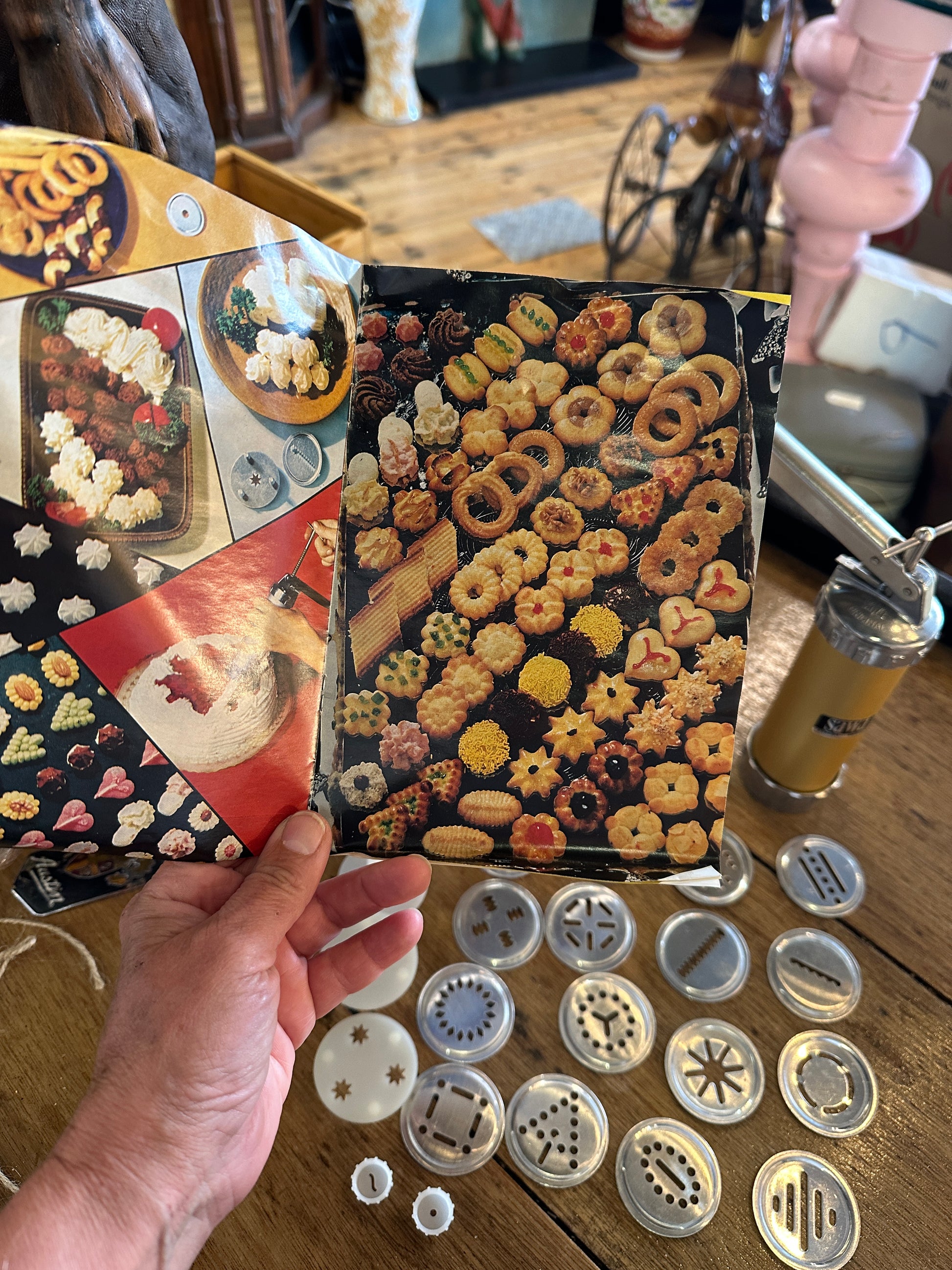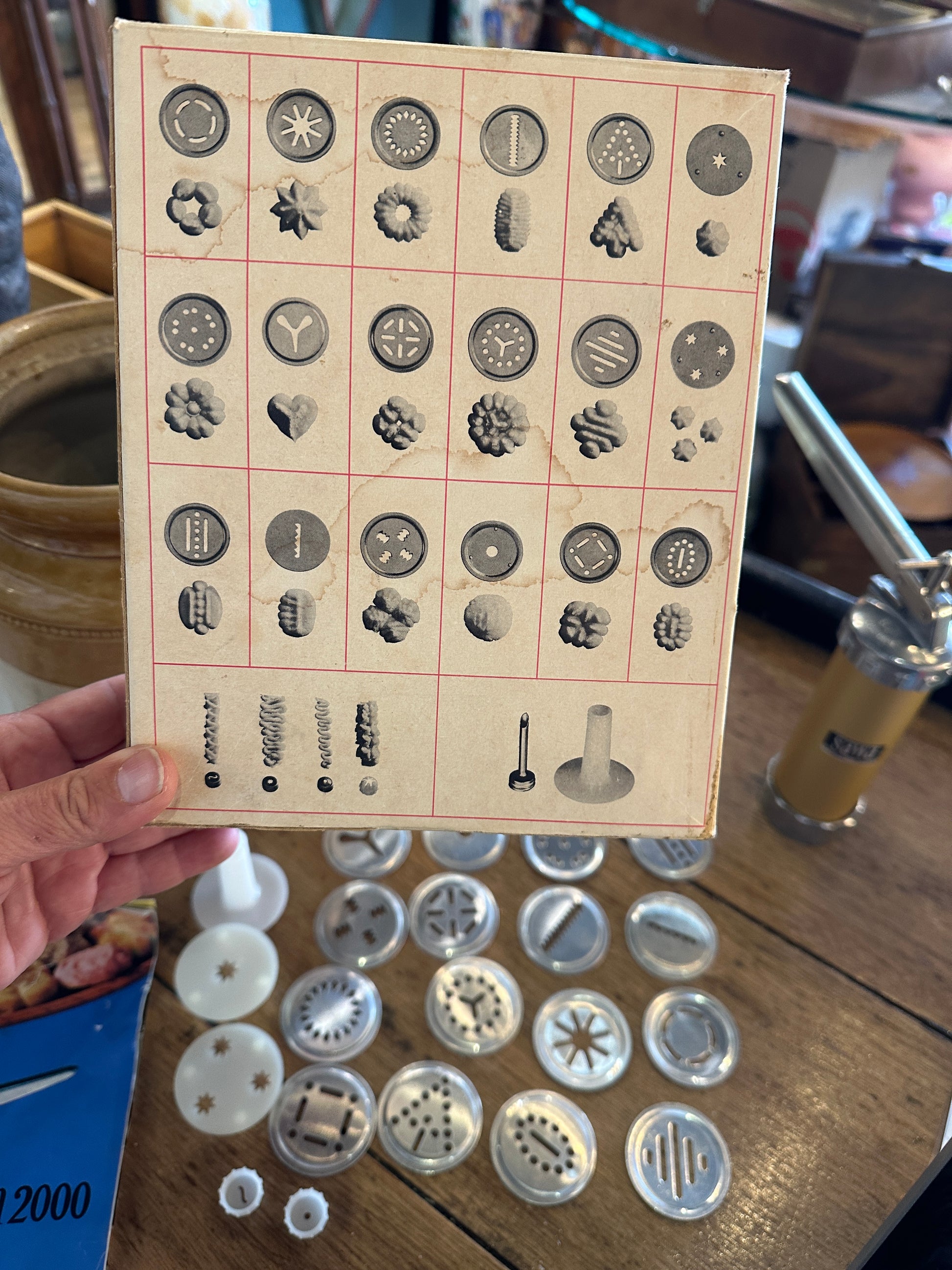 This complete boxed set includes 16 interchangeable aluminium disks/patterns for a variety of cookie designs. With the included instruction book, you can easily create delicious and perfectly shaped cookies in no time. Elevate your baking experience with this vintage cookie press.