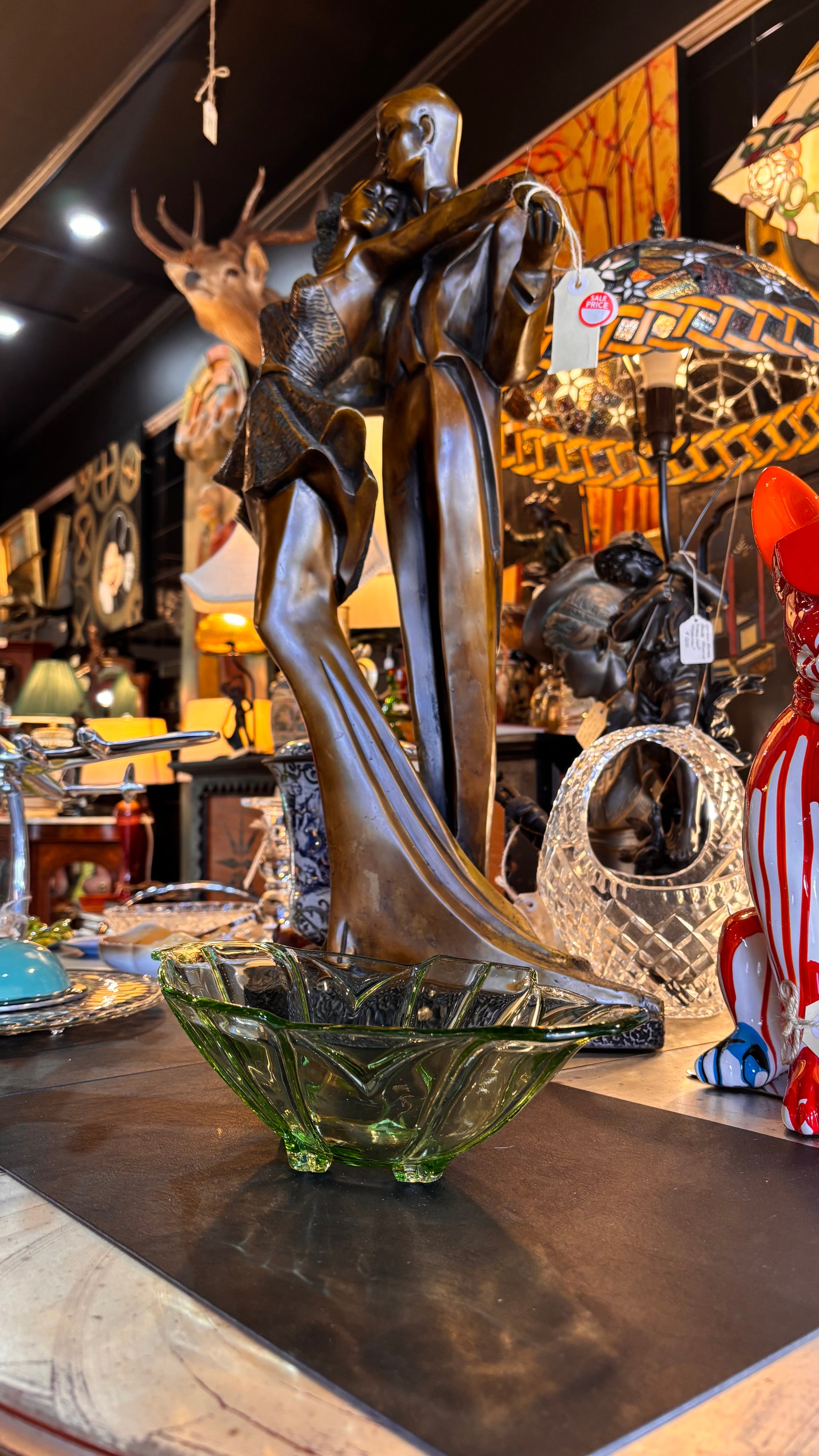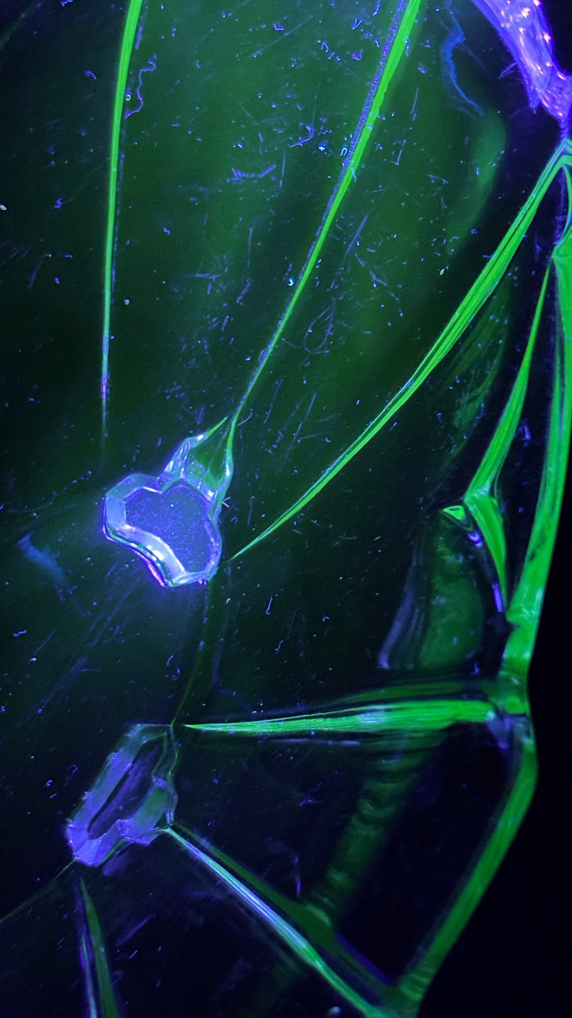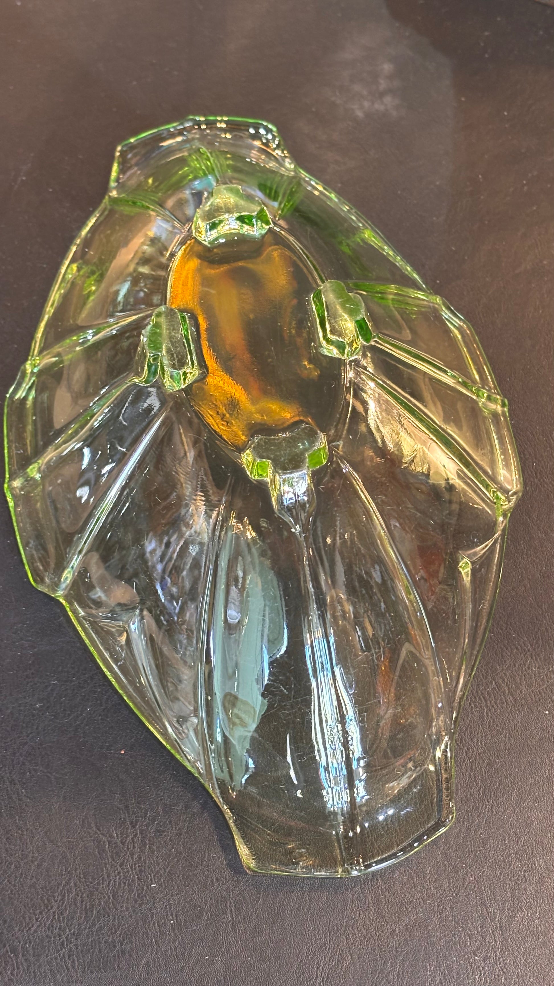 Striking vintage uranium glass bowl, measuring approx. 30cm long. Crafted in an angular floral-inspired form, this elegant piece glows under UV light due to its uranium content, popular in pressed glass from the 1930s–50s. A beautiful display object or collector’s piece with unmistakable Art Deco flair. Excellent condition with no visible chips or cracks.