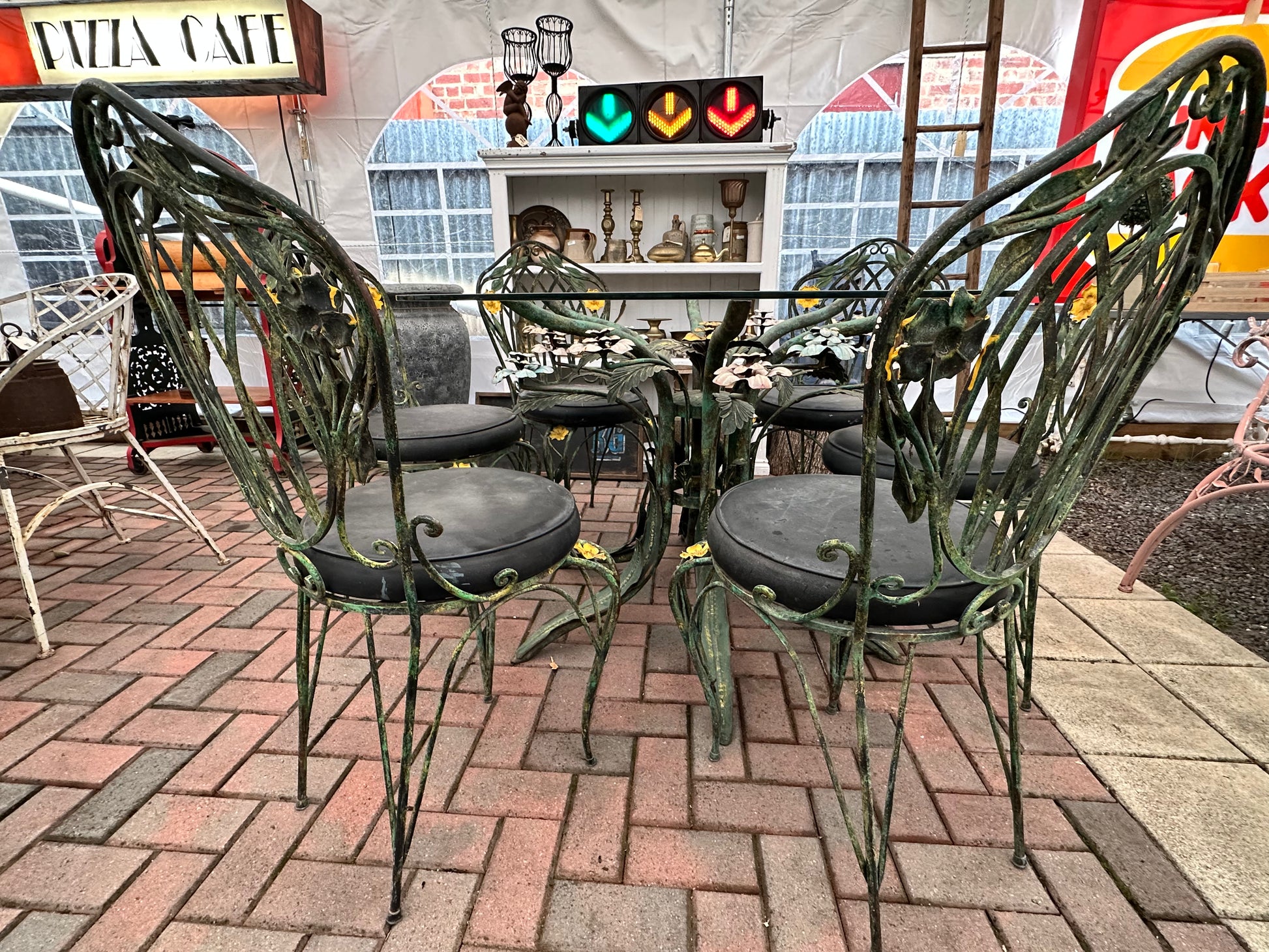 Made from durable wrought iron with a weathered finish, this set is ideal for patios, gardens or sunrooms, offering both a striking aesthetic and practical functionality for alfresco dining, perfect for collectors and homeowners seeking to infuse their spaces with vintage sophistication.